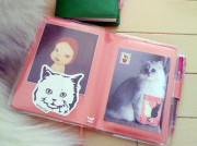 愛猫の写真・奈良美智さんのハガキ・ ネコステッカーをカバー・オン・カバーに 挟んでいます。