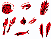 赤と黒で描き上げられた野菜や魚やきのこたちは、