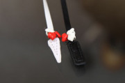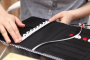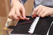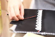 ▲このレースは外ポケットのところにつけるようです。長さをチェック中。