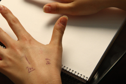 手の甲にボールペンで