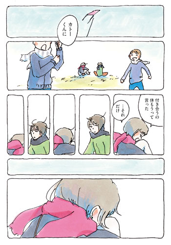 | ほぼ日 | あと、そういう手法と、 マンガのテーマがすごく合っているというか。 今日さんのマンガって、 日常の風景とか、心の繊細な動き、 みたいなものを切り取ったものが多くて、 それがあの絵で描かれるから、 読んでいて、すごくドキドキするんです。 |