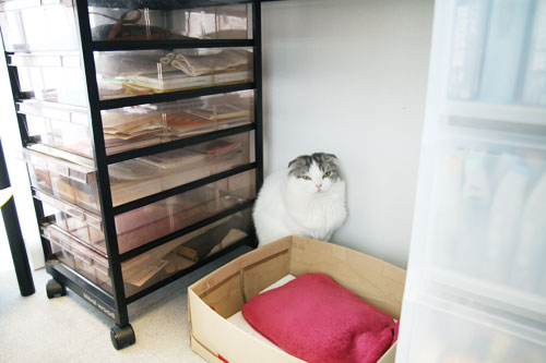 ![]() ▲お仕事場にて、作業をする今日さん。 ![]() ▲足下には猫のムームちゃんが。 |