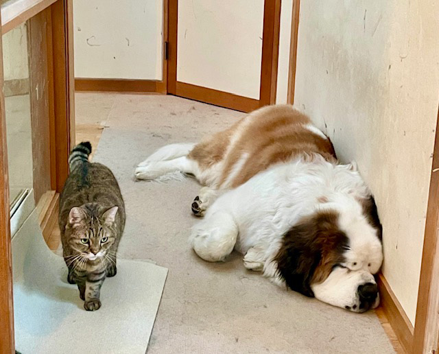 寝ているスヌーの横を通るネコのジャイ、