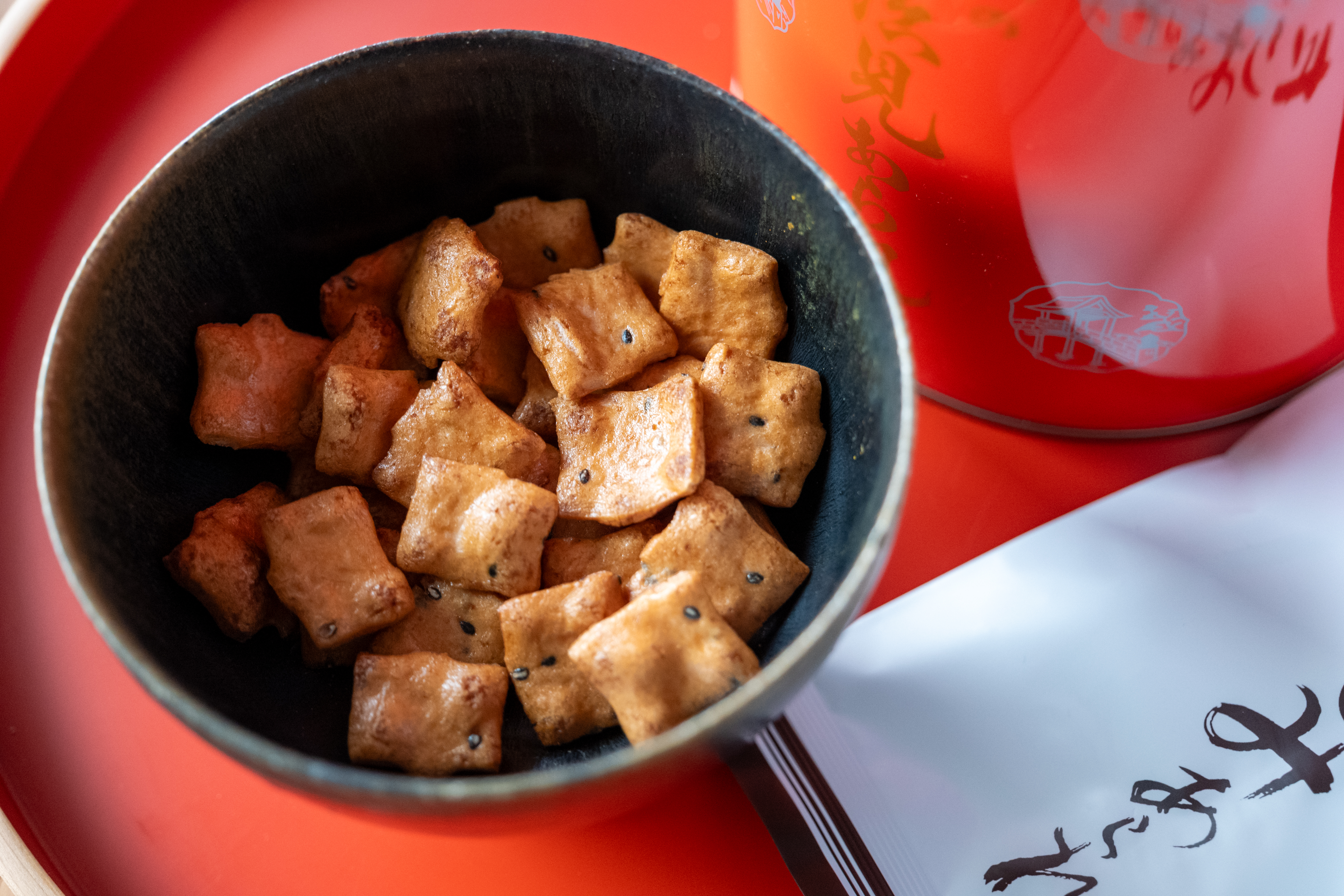 「村瀬の多治見あられ ごま風味」(缶入り)。