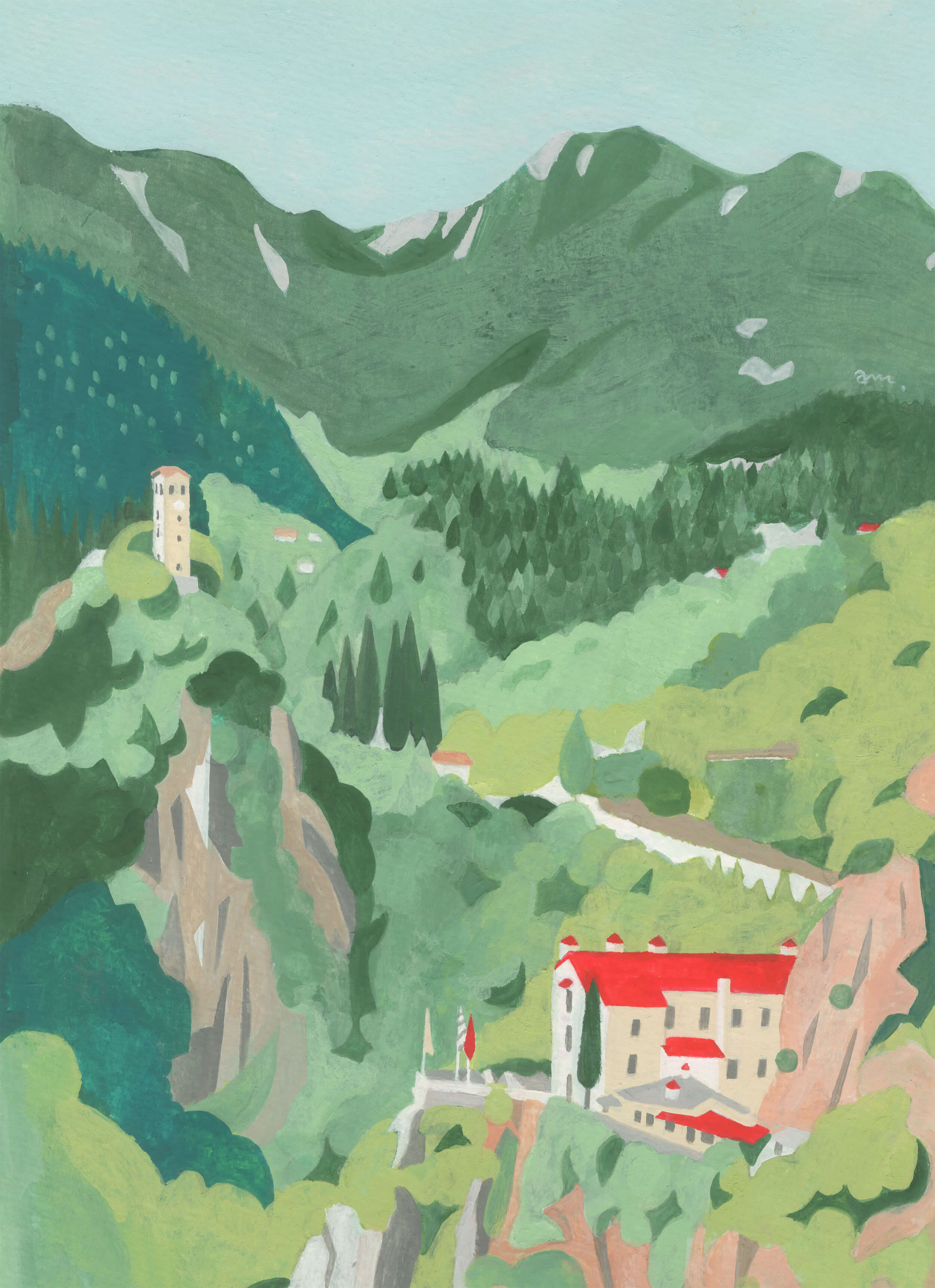 山の緑と鮮やかな赤い屋根のコントラストの美しいこと!