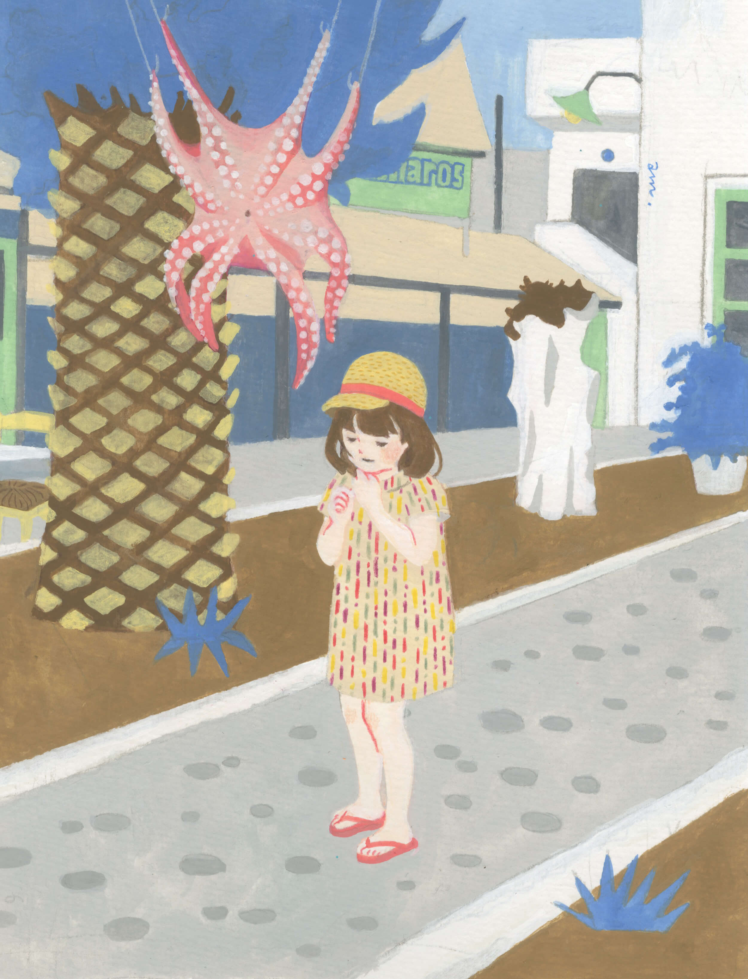 干されているタコの下を恐がりながらも興味津々に通る様子が