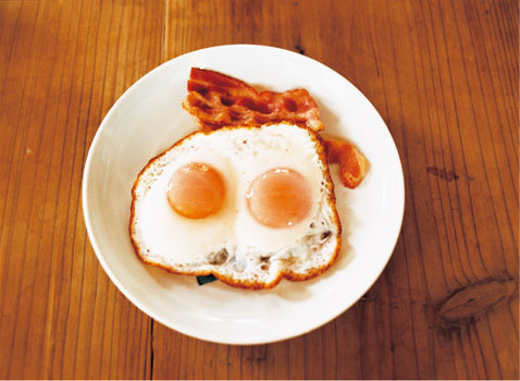 もういちどベーコンエッグを見てください。 じつになんでもないようなベーコンエッグですけど、 よく見ると白身のはじっこが「かりかり」です。 黄身はほどよく半熟で、でもうっすら白くなってるから、 ホテルで出すような「超弱火でじっくり」の ぷるぷるの目玉焼きとは、ちがうわけです。
