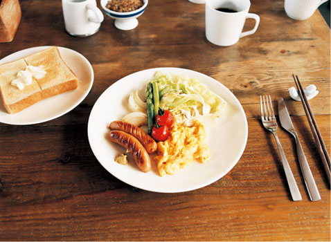 ハマダで供される、ある日の朝ごはんです。 スクランブルエッグ、切れ目を入れて焼いたソーセージ、 焼き野菜(アスパラもトマトも焼いているそうです)、 それから十字に切れ目を入れたトースト。 さいしょからバターがのっているところとか、 洋食なんだけれどおはしもあるところとか、いいなあ、と思うのです。