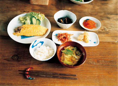 こちらもある日の朝ごはん。 具いりのオムレツ、ひじき煮、いくらの醤油づけ、 にんじんのごま和え、こふきいもに砂糖と醤油をからめた 甘辛こふきいも、おみそ汁。そして、オムレツは、 砂糖と醤油とお酒で炒めたたまねぎと合い挽き肉入り。