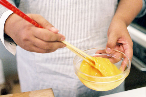 だしを冷ましてから卵にといて、 おしょうゆをすこしさします。 お塩でうすじょっぱく味をつけています。 分量をはかったりは、まず、しません。 「だいたいの感じ」がだいじ、みたい。 気になったら味見をすればいいのです。