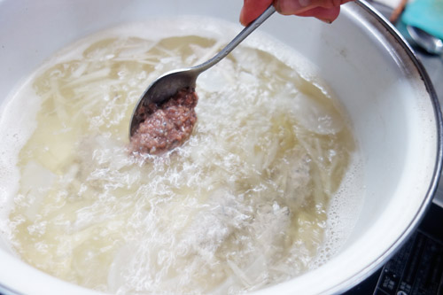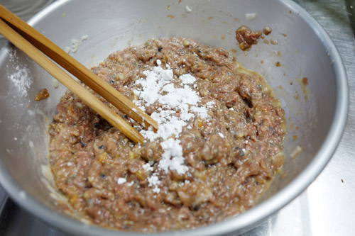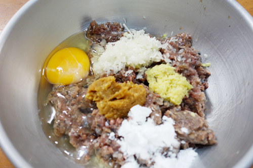 みじん切りのネギと生姜汁を加え、よく混ぜます。