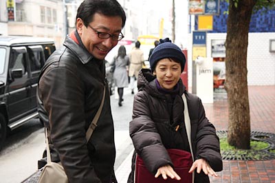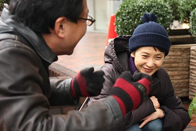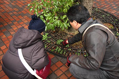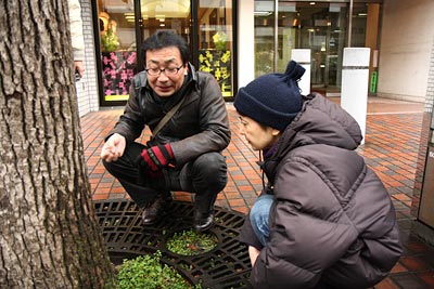 「ほぼ日」のビルから数歩、 そとに歩みだした吉本由美さんと諏訪雄一さん。 左右に続く骨董通りには、 とぎれることなく自動車が流れています。 見上げれば、うすく曇った冬の空。 歩道を行き交う人々は、一様に先を急ぐ足取りです。 そんな中で、視線をついと下へ向ければ‥‥。 冬の都会での「みちくさ」がはじまりました。