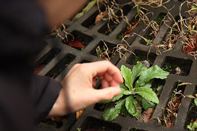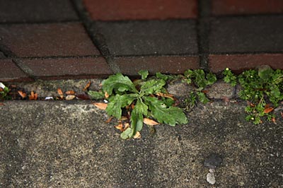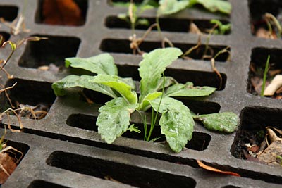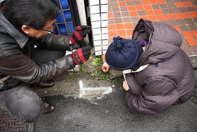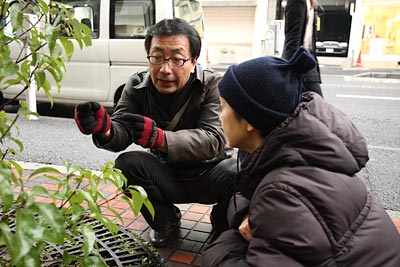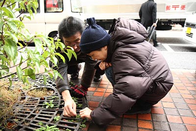 「ほぼ日」前の骨董通り。 冬のみちくさをはじめた吉本さんと諏訪さんは、 街路樹の根元にカモミールをみつけました。 鉄のわくのようなもので覆われた街路樹の根元には、 ほかにもいくつかの緑が育っています。 吉本さんが、そのひとつを指さしました。