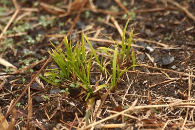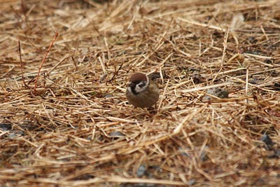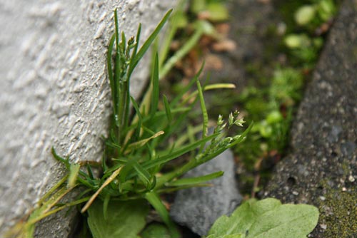 草に名前を付けた人のイマジネーションの豊かさには、 いつも感心するのだけれど、 中でもイヌノフグリとコダカラベンケイの 名付け人の脳働きには脱帽している。 道端などで小さな葉っぱをたくさん付けて 這って生きている10センチあまりの地味な草の、 丸い玉が2つ繋がったような果実の形が、 犬のフグリ(タマタマというか陰嚢)を思わせるから イヌフグリ‥‥ と考えた人はどこのどなたか。 周りがギザギザになっている長三角形の葉っぱの、 そのギザギザの窪みにそれぞれに芽を付けて、 かなりの数の子孫を地面にばらまいている ぶよっと肉厚の多肉質植物を、 コダカラベンケイと呼んだ人は、 どういう暮らしをされてきたのか。 そういうことをつい考える。 スズメノカタビラもそれに続く。 カタビラ(帷子)とは単衣の着物のことだけれど、 まさかこの、背の低いちっぽけな草の、 普通は気付かない数ミリ単位のささやかな花穂を 雀の着物に見立てるとは、 いったいどういう感性の持ち主だろうかと 興味を持った。 私も庭の草毟りではこの草と対峙するのだ。 というか、一方的に抜き殺すわけだけれど。 そのとき花穂もたびたび見てきた。 しかしあれを雀に着せてみようかという発想には、 残念ながらまだ至っていない。