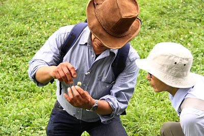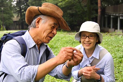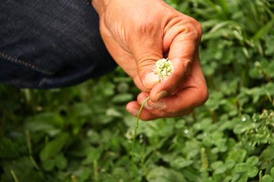 梅田さんの“花の向き”の会話の補足。 シロツメクサの花を“頭花”と呼び、 花茎のてっぺんに小さな花が集まって ポンポンみたいに丸くなり、 そこで順繰りに開花を待つのだ。 開花前の蕾はぜんぶ上向きに付いている。 が、受粉して咲き終わった花は下を向く。 これは、訪れる虫に「もう私は終わりました」、 「受粉を待っているほかの花を訪れてみてください」 と告げるサインで、 どこかしら『源氏物語』を彷彿させるが、 一つの頭花がまんべんなく受粉するための工夫という。 毎度のことながら植物の知恵に頭を下げているわけである。