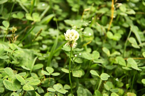 シロツメクサ(クローバー)は明治時代、 牧草として大量に種子が輸入され、 日本各地に生息地を広げた帰化植物だ。 葉は地上を這い、 茎の節から根を出すため“踏みつけ”に強い。 通常、葉は三つの小葉からできているが、 四つ葉(幸福になるとか)や 五つ葉(不幸になるとか)もある。 それは遺伝子の突然変異によるものらしいが、 “踏みつけ”によるストレスなども関わっているのでは? という説もあって、考えさせられた。 もし踏みつけストレスで葉が増えるのなら、 「世界一多くの葉を持つクローバー」として 現在ギネスブックに登録されている、 2009年5月に岩手県花巻市で発見された “56枚葉のクローバー”の、 そのストレス量たるやいかほどだろうか。 花巻には牛がいっぱいいるものなあ。
