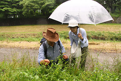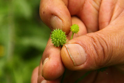 このすぐあとに梅田さんは、 キツネノボタンのほうも見つけてくださいました。 果実の部分のトゲトゲの先が、 そりかえるように曲がっていればキツネノボタン。 まっすぐか、もしくは少し曲がっている程度なら、 ケキツネノボタン。 覚えました? ところで、このみちくさ中には、 キツネノボタンの「ボタン」は 洋服のボタンのことだと思い込んでいたのですが、 のちほど、そうではないと知りました。 正しい名前の由来は‥‥? 吉本さんのエッセイをお読みください。 次の「みちくさ」は、火曜日に。 「のがわでみちくさ」編は、 火曜日と金曜日の更新でまいります。