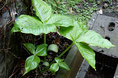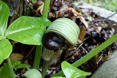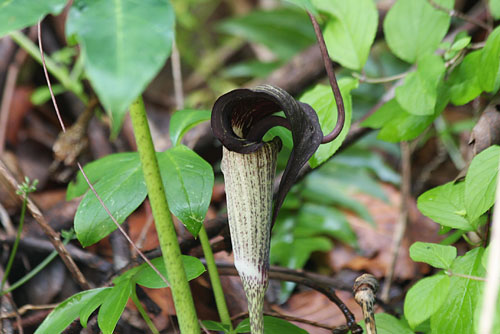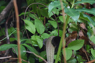 その昔、20年くらい前だったろうか、 NHKが放送した 英BBC制作「アッテンボローの植物たちの挑戦」という ドキュメンタリー番組でやっていた ウツボカヅラの“繁殖戦略”には驚いた。 その素晴らしい知性に。 ウツボカズラ、というと 「ああ、食虫花ね、気持ち悪い形の」と、 簡単に言い捨てられる傾向にあるが、 虫を誘き寄せ捕らえて溶かす消化液入りの あの袋(靫)の製造工程を知れば 誰だって一目おきたくなるはずだ。 東南アジアの森でひっそりと暮らすウツボカズラ。 その成長をカメラ早送りで見るとまるで工場だった。 精巧な靫(うつぼ)作りの第一弾は、 葉の先端を細い蔓状にしてぴゅるぴゅると伸ばすのである。 中央脈と呼ばれるそれは枝に付いた葉の先から、 下へ下へ、大地の方へ、より良き条件の一角へと、 ぴゅるぴゅるぴゅるぴゅる伸びていく。 土に触れたら、 今度はその触れている部分をむくむく膨らませる。 それがほど良い大きさの空洞の袋状になると、 上部をパカンと開けて屋根と入口を作り、 入口のその縁は くるっと外に捲ったような滑りやすい形に整え、 袋の中には消化液を溜め、 入口付近には密を配置し、 そして満を持して虜となる虫の到来を待つのである。 日本の小さな町工場から 世界を席巻する優秀なマシンが 生まれたときに通じる驚愕をおぼえたのだった。 ウツボカズラに尊敬の念さえ持った。 森さんが「ほら」と指さすところにひっそり咲いている ウラシマソウの茶褐色の花を見たとき、 昔々のその驚愕が蘇ったのだ。 形状が遠い親戚程度にちょっと似ていたから。 花の脇からぴゅるぴゅるぴゅると細い蔓状のものが、 まず上に伸び、 次に下へぎゅゆんと垂れている。 それが釣り竿みたいに見えるから ウラシマソウと言うらしい。 なるほどね。 それも素敵な命名だけれど、 でも、この臙脂色を含んだ茶褐色の色合いや ほっそりと柔らかにふくらんだ仏炎苞の形が、 私には浦島太郎というより エレガントなご婦人の雰囲気を感じさせ、 となると、わずかな差だけれど 英名コブラ・リリーのほうに軍配を上げたいような。 その親戚筋のムサシアブミも 小ッさくていじらしかったなあ。 森さんの話では ともに公園やお寺の境内などに植わっているそうだけれど、 あんまり控えめなので、 目の悪い私はこれまでの長い生涯 見つけることができなかった。 だから今回が初のご対面。 これからは日の差さない隅っこを通るときには注意しよう。 追伸 前回のナズナについて読者の皆さんから メールでいろいろ教えていただきました。 ビンボウグサって主にハルジオンのことを言うんですね。 私はナズナの記憶があったのでそう書いたのですが、 違和感をおぼえられた方が多いようでした。 森さんにお聞きしたところ、 ビンボウグサという名は いろんな雑草に付けられている俗称で、 ナズナをそう呼ぶこともあるそうです。 また、ペンペンという音の出し方が間違っていたようで、 正しい出し方も皆さんから教えていただきました。 実の裂け方も違うようですが、 私の庭にいたペンペン草は星形だったし、 やはり遠い親戚筋なのかと思いますが、 もう姿が消えているので森さんに確かめようもありません。 いろいろなご指摘ありがとうございます。 みちくさに詳しい皆さんがごらんになっているのが判って、 素人の私やスタッフは背を正しているところです。