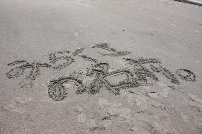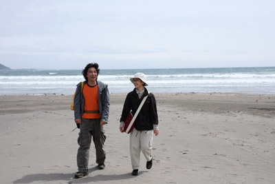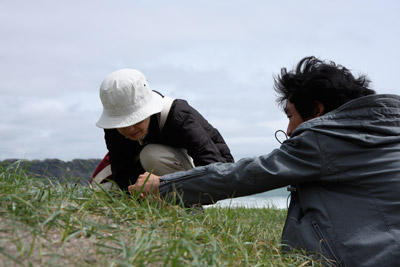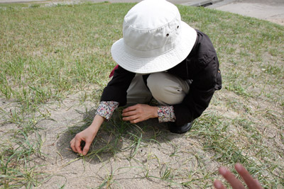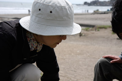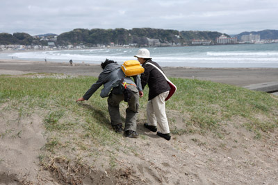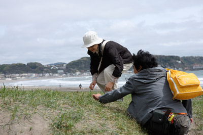 春の鎌倉での「みちくさ」は、これで最後になります。 波の音が耳にここちよい由比ヶ浜で、 今回ラストの、みちくさの名前を覚えましょう。 砂浜の手前の、すこし丘になった場所に、 森さんが吉本さんを案内します。