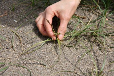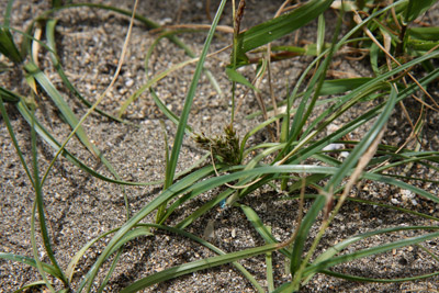 知らないと、人間どんな酷いことだってしてしまう。 砂場に生えている地味な草‥‥ という認識しかないときは、 踏んでも押しつぶしても気にならなかった。 それがいったん名前を知り素性を知り性質を知ると、 もうとてもそんなことはできない。 森さんに“下から目線”と教わり蹲ったときも、 ちょっとでも踏むことなきよう気を配った。 つくづく“知る”ことの大切さを思う。 そして“下から目線”の楽しさも。 同じ位置から見る雌花穂の むくむくぽっこりとした可愛い形。 雌ながら“岡本太郎”と呼ばせてもらおう。