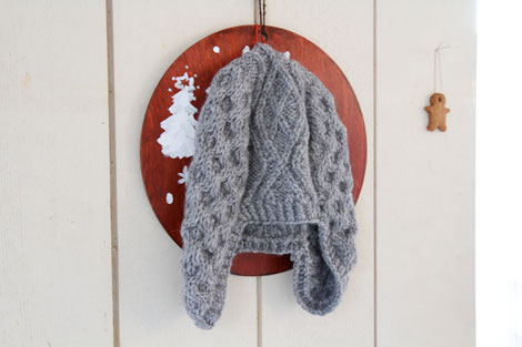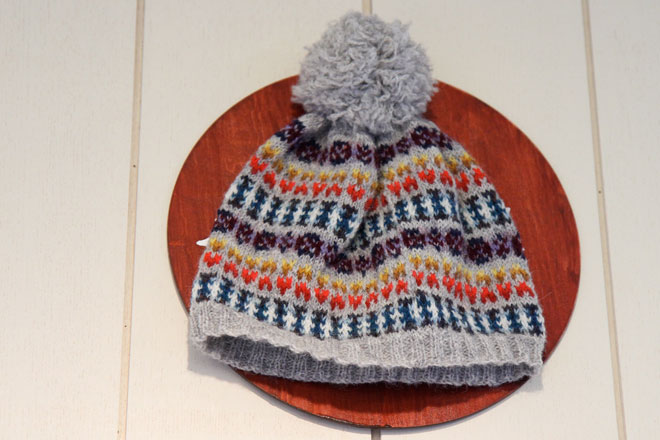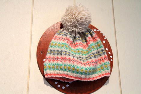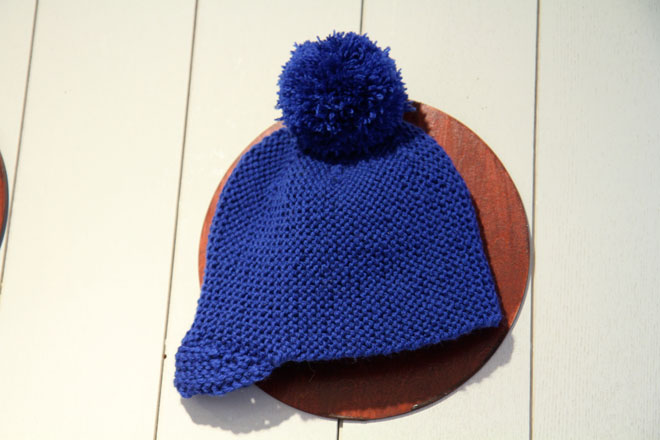 「ダイヤ柄が特徴のポンポン帽子。 |