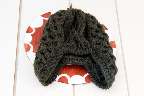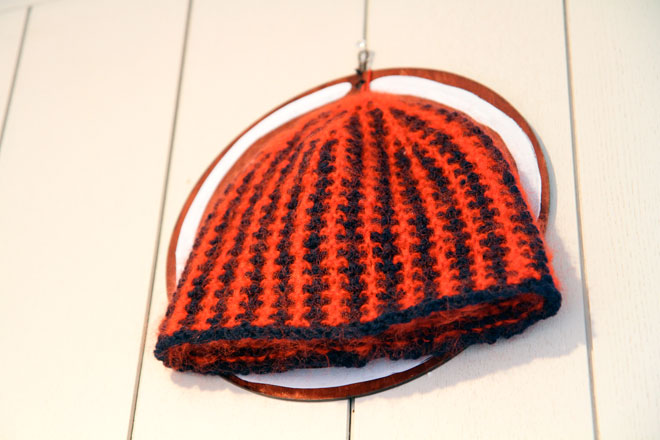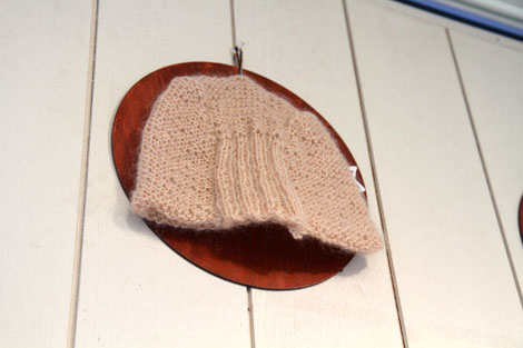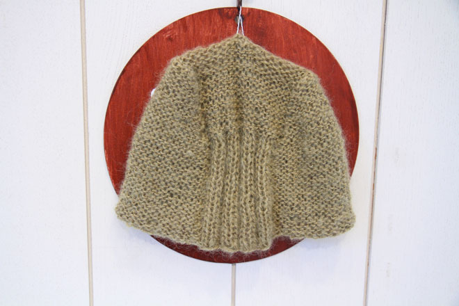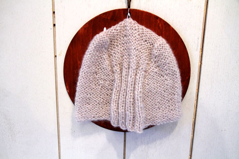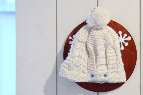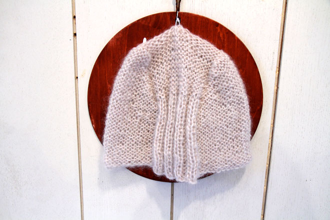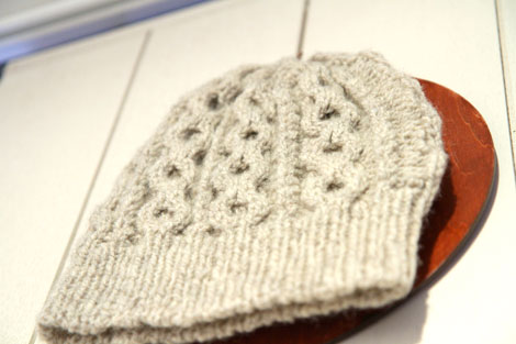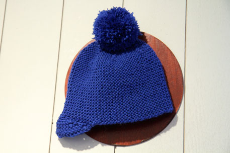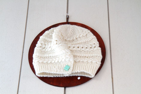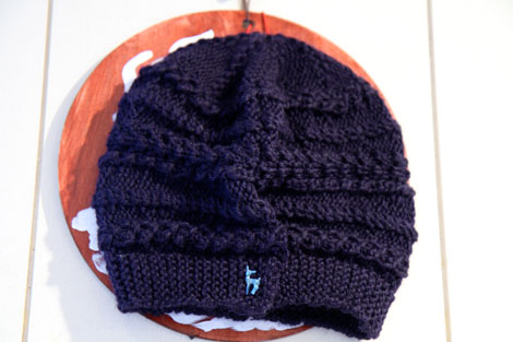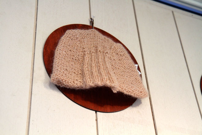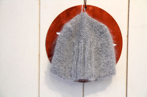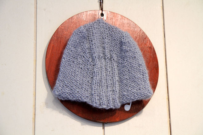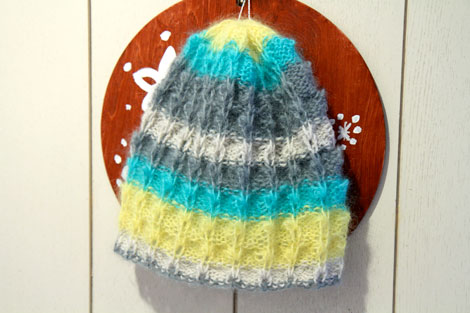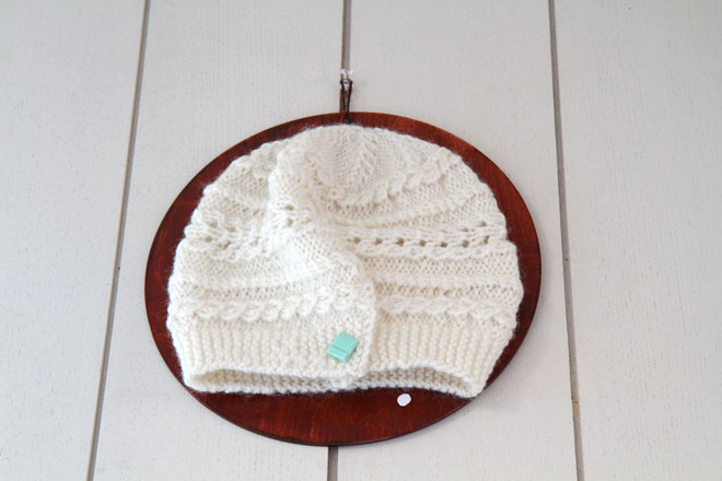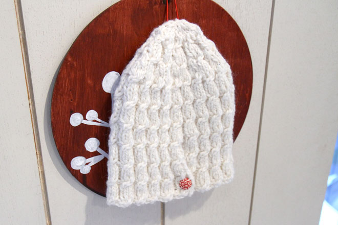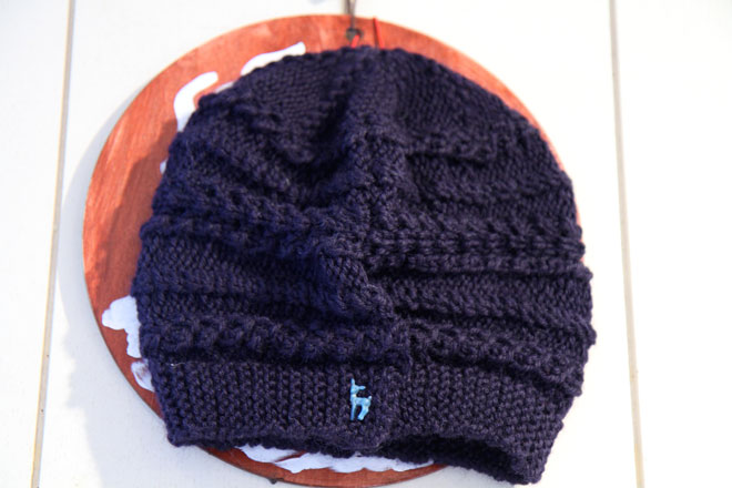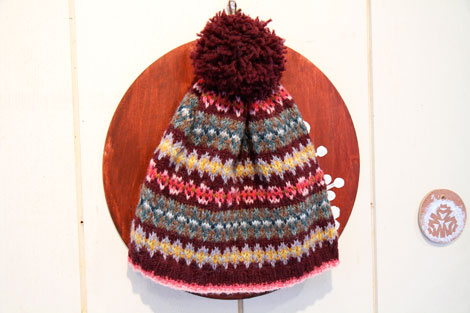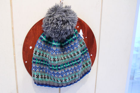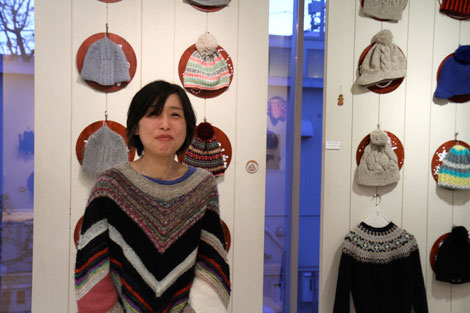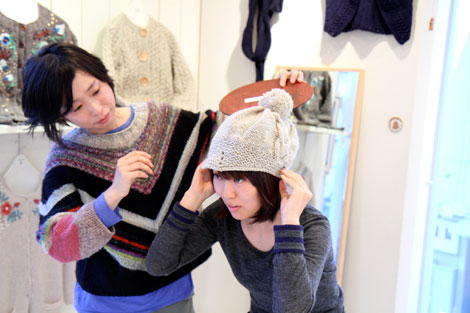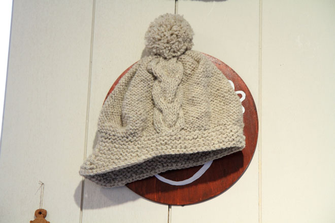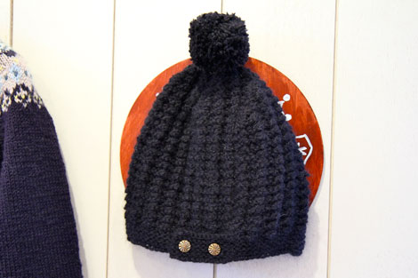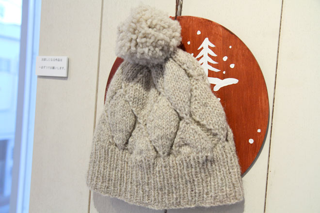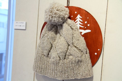 「これもデッドストックの毛糸で編んだ帽子です。 |