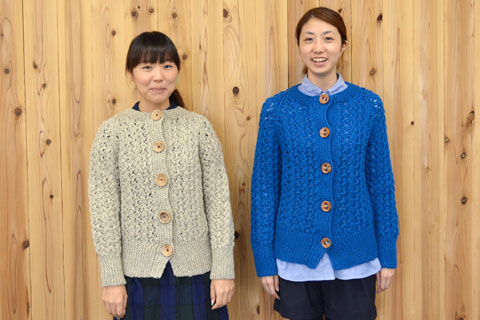 | 使っている糸が違っていて、 ベージュのほうが 腕をキュッとつかまれるような フィット感があるんですよ。 ブルーのほうはゆったりめです。 |