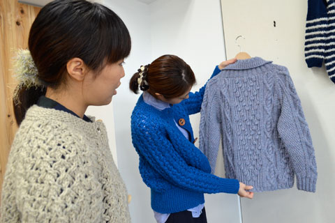 | じゃあ、みちこさんには、 受験生に見えないのも着てもらわないと。 ええと‥‥それとか、どうかしら。 |
