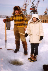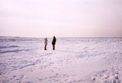 12/29/2001 シベリア鉄道の旅 DAY 3 ハバロフスク着。 ![]() 早朝、ハバロフスク着。 お世話になった車掌さんと記念写真。 最初はクールで厳しい人かと思ったけれど、 最後には照れやさんだと分かった。握手をしてバイバイ。 クルーがまだ暗いハバ駅の撮影をする間、 雨宮さんと二人で待っていた薄暗い待ち合い室は ものすごく寒く、 ウラジオでは感じなかった‘シベリアの寒さ”に いよいよご挨拶..。 かろうじて開いていたキオスクでコーヒーを買う。 ![]() 雨宮さんが飲みかけのコーヒーをちょっと置いた瞬間、 ホームレスのお兄ちゃんの手が伸びてきて、 堂々と飲まれてしまうので、ビックリ。 少し残してテーブルに置いておくと すぐに“吸収”される。 西野さんに聞くと、少し残したら ホームレスの人のためにそのまま置いておく、 それが暗黙の了解なんだそうだ。 隣のおばちゃんも魚のフライ? のようなものの 食べかけを置いて行き、 同じお兄ちゃんにすぐに“吸収”されていた。 壁にある古い大きなシベリア鉄道の路線図を見ながら、 まだまだ全然先は長い...と実感する。 シベリア鉄道はロシアの下のほうを 通っているみたいなので、 シベリアの北のほうの途方もない 未開の土地を想像して気が遠くなる。 ロケバスで駅からホテルへ移動。 バスから見た町並みは、 黄色がかった街灯の色で雪がぼやけて綺麗。 15分ほどでホテルに到着。 9時の朝御飯まで仮眠をとるはずだったのに、 だんだん白んでいく空を見ながらボーッとしていたら 8時くらいになってしまい、 2、30分しか眠れなかった。 ボーッとしながらの朝御飯。 知らないうちにカメラクルーはもう出動していた。 だだっぴろいレストランはすきま風が入るのか、 薄着では鳥肌が立つ。出てきた料理もヘンで、 コーンフレークのミルクが生暖かかったり、 コーヒーはぬるく、 すべてが微妙でちょっと悲しかったが、 全体的なビミョーさがだんだん可笑しくなってきて、 雨宮さんとずっと半笑いのままの朝御飯だった。 ![]() 11時LOBBY CALL。 先に早朝の実景を撮りに出ていたクルーが帰ってきて、 「寒い!!!! ヤバイっっすよ!!」 とおどかす。 ためしにコートなしで外に出てみようとして、 ドアを開けた途端あまりの寒さに 反射的に室内へUターン。 部屋に帰り、さらに着込んで、ダルマ状態。 今日はNational Standardのワカ (デザイナー若林さん)から頂いた ベージュのダウンを着てみる。 20471120のみふー(御船さん)にもらった ムートン帽子も持って。 皆、シベリアに行く私を心配して、くれたもの。 みんなに守られて歩いている感じがする。 絶対に履きたくなかった巨大な雪靴にも、 早速お世話になる。 ![]() スキー靴を履いている時のように うまく歩けないモコモコ姿で、 意を決してガラスの重いドアを開けると、 その瞬間、身体の内部がキュンと冷たくなる。 これがあの有名な「鼻が凍る」現象か! 鼻の中が、パリッというかサクッというか、 霜がおりてるなーという感触。 気温、マイナス15度。 ![]() ロケバスが坂を上がっていくと、 真っ白い展望台が見えてくる。 ドキドキしながらバルコニーのようになっている 展望台の中に入ると、 目に飛び込んできたのは、アムール河。 視界の隅々にまで広がる、広大な氷の大河に、 圧倒されてしまう。 向こう岸までテクテク歩いている人もいるし (対岸に別荘を持っている人々らしい!)、 なんと車も走っているし(危ないってば!)、 氷の上で工事までしている(なんのだよー!)。 唖然。これがシベリアの規模..。 ふと、鳥の鳴き声が響く。 下を見ると、白黒の鳥が何羽か飛び交っている。 再度ロケバスに乗って、下の河のところまで降りて行く。 まるでビーチみたい。 眩しくてたまらない。 サーシャによると、 通常50センチほどの氷が張っているが 今年は暖かい(!)のでそれより薄いかもとのこと。 いよいよ、河の氷の上へ。 おそるおそる、足を踏み出すと、 砂利の上に積もった雪とは少し違う音がする。 ホントに落ちない? 割れない? びくびくしながら、一歩一歩。 でもすぐに、びくともしない氷を足が "地面"と認識し、慣れてしまう。 ![]() ディレクター上野さんに 「音を見つけられるまで」 と言われたので、好きに歩いて行く。 ハイになる。 ずぅっと歩いて対岸まで行けそうな気がする。 方向を見失いそうだけれど。 しばらく歩くと、氷が平たんではなくて 波のような形になっていることに気付いて、感動する。 風の形か、波の形か。 でも氷の下は、いつも通り川が流れている...。 ずっと耳をすましていると、 風の音が、まるで波の音のように まるく、甘く、流れてくる。 それがアムール河でみつけた音、 ただの風の音じゃない、 氷の大河の上でしか聞けない、 感じられない、風の声だ。 その後、同じ河の別の場所へ移動する。 もう河の上を歩くのも慣れたものだ。 釣りをしているおじさんの所へ歩いて行く。 よく写真で見るように、 氷に穴を開けて糸をたらしている。 おじさんの足元