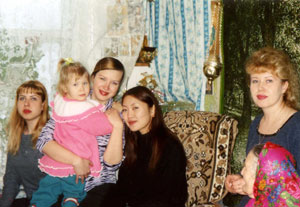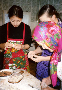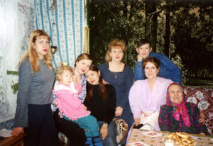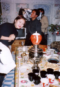 1/9/2002 シベリア鉄道の旅 DAY 14 PART 2 ウリァーナの家。 彼女の家は、木造の小さな家。 木の小さな門を開けると、 家の外で無邪気な犬が犬小屋に繋がれたまま、 キャンキャン動き回っている。 家の中に入っていくと、アヨーシャさんの家のように、 もわぁ〜んとあったかい空気に包まれる。 またまた、カメラのレンズ、曇る。 入ってすぐがキッチン。 いきなり、バブーシカが、抱き締めてくる。 バブーシカとは、おばあちゃんのことだ。 彼女は鮮やかなピンクの花柄のスカーフを頭に巻いて、 顎のところで結んでいる。 (一時期日本でも流行った、頭に巻くスカーフや布を “バブーシカ”と呼んでいたが、 それはロシアのおばあちゃんということなのです。) キッチンと繋がった部屋には 小さなソファーとタンスがあり(リビングルーム?)、 その奥にダイニングテーブルが見える。 親戚が集まっているようで、 みんなの笑顔とHUGに迎えられる。 ウリァーナは凍った髪の毛を溶かすように 三つ編みの髪をほどいて、 ブロンズ色の髪をブラシでとき、 またきつく編み直す。 その腰まである髪の長さにギョッとする。 軽く揃える以外は生まれてから一度も 切ったことがないそうだ(!)。 昨日会った、ウリァーナのお姉ちゃん オーリヤも家で待っていた。 ポッテリな真っ赤なクチビルが可愛い★。 お母さんは随分とおめかしに気合いが入っていて、 おじさんはただただアヤしい‥‥。 胸元に入れて持って帰りたいくらい可愛い子猫がいて、 ブルブルブルブルふるえていて、 寒いの? 寒いの? とむりやりずっと抱いているが、 どうやら私の手が冷た過ぎてふるえていたらしい‥‥。 ごめんよ。台所の端にはダンボールと樽が置いてあって、 布巾がかぶせてある。 何かがモゾモゾと中でうごめいているので、 恐る恐る布をまくってみると、ニワトリだった!! ニワトリも、マイナス20度以下では さすがに死んでしまうらしい。 だからダンボールに入れて 家の中に置いているらしいのだが、 しかしこの狭いダンボールに 何匹も一緒に閉じ込めるのもどうなのかなぁ。 外に出て、犬とも遊ぶ。 もちろんマイナス温度の世界。 かわいそうとも思ってしまうけれど、 犬は犬で身体も精神も適応しているわけだから、 これでいいのだろう。 ごはんが骨だけ? にもちょっとびっくり。 ウリァーナとバブーシカと一緒に御飯の仕度をする。 ペルメニと、ブリニー。 ペルメニは、ロシアン水ギョーザ。 ブリニーは、ロシアのクレープ。 薄くササッと焼くのだが、 さすがウリァーナ、手際が良い。 坂本家では、クレープを焼くのは 兄の役目だったので、 あまりやったことがないが、 なんとかうまく焼くことができる。 次に、パン生地のようなかたまりを 餃子の皮のように薄くして、中身の肉を包む。 それを大量に作って、どんどん茹でていく。 ペルメニを茹でている間に、漬け物を切る。 様々な野菜の漬け物。 ピクルス、ピーマン、なす、きのこ。 ピーマンの色彩がものすごく鮮やかで、 一つ一つが違う色をしていて、 ピカピカに光っていて、本当に綺麗だった。 全部家庭菜園で収穫した食材。 漬け物は長い間漬けられていて、 瓶の封は開いていなかったから、 本当はとっておきの物なんだろう。 そんなところからも、 日本からゲストがやってきたこの日が 家族にとってスペシャルイベントなのだ、 という事が伝わってくる。 ガマンできなくて、切りながらピクルスをつまみ食い。 すっっごく美味しい!! 食卓に乗り切らないくらいお皿を並べ、 さぁやっとみんなで食事。 ボウルに積まれた大量のペルメニは、 サワークリームとロシアンわさびをつけて‥‥キャー! むっっっちゃくちゃウマい!!! ブリニーは、サワークリームや自家製ジャムをつけて、 焼きたてを頂く。これもほんっっとうにオイシイ‥‥。 止まらなくなる。CREWにも 「早く! 冷めないうちに早く食べて!」 とすすめて、みんなで食卓を囲む。 CREWのみんなもおじさんと仲良くなって、 よかった(笑)。 食事が一段落したところで、 エカテリンブルグに古くから伝わる歌を 家族で歌ってもらう。 おじさんが一人で暴走して 家族が呆れているのが可笑しかった。 おばあちゃんの歌っている時の口が たまらなくかわいい。 お姉さんのオーリヤはお年頃の若者らしく、 たまに「やってらんないわよね〜」 という顔をしていた(笑)。 そして、恥ずかしくて気が進まなかったけれど あまりに期待されているのでしょうがなく、 自分も「Shanandoh」を歌う。 小学校の頃からコーラスグループで歌っていたこの曲。 アメリカの民謡ともいえるかもしれない。 バブーシカは私の亊を 「もう一人の孫」と言ってくれた。 初めて会った人々なのに、 家族の中にこれほどまで受け入れられている、 というのが信じがたい。 なんでこんなに優しくしてくれるんだろう? なんで初めて会ったのに これほどまで私の事を分ってくれているような 目をしているんだろう? おばあちゃんは、なんで