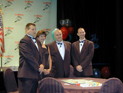 | アメリカモノポリー事情(7) 〜NY、「聖地」アトランティックシティに 行ってきました(7)〜 「モノポリー米国選手権の巻その3」 決勝進出者は世界選手権同様、 ハズブロ社が用意した タキシード(男性)やドレス(女性)に着飾り、 決勝の舞台は十分整いました。 楽団の演奏するマーチにのって、 大会参加者並びに決勝進出者が入場し、 最初に大会参加者が一人一人の名前を読み上げてもらい、 出場証明書を壇上にて贈呈されました。 また決勝開会のあいさつをされた副社長から、 私も紹介してもらいました。 ついで決勝進出者が呼ばれ、いよいよ決勝がはじまります。 ゲーム展開ですが、 ある一人のプレーヤーが 「ダークパープル」という一番安い土地を ダイス(サイコロ)だけで独占し、 続いて前回チャンピオンの友人が 「ダークブルー」という一番高い土地を 同じようにダイスだけで独占しました。 <注:「ダイスだけで独占」とは、 人とは一切交渉せず、 自分出したダイスの目によって購入し、 自力で独占すること。> この後、この方が「ダークブルー」以外の権利書を 安価で他のプレーヤーに売って、 ダークブルーの経営に専念します。 ただ、ダークパープルのホテルにつかまったり、 他の権利書を買うためにダークブルーの家を崩したりと、 経営がそんなに順調でなかったためか、 他のプレーヤーの追随する動きが緩慢でした。 結果としては、 ダークブルーの経営が軌道にのってしまった後は、 特に山場らしいものがなく、 押し切ってしまうことになりました。 くしくも、ダークブルー6軒→ ホテルからイエローホテルとなり、 最後はベントノールで仕留めたところは、 私の世界選手権決勝と全く同じでした。 表彰式も非常に華やかなもので、 優勝賞金は世界選手権と同じ$15140が贈られました。 私も、新チャンピオンのお祝いをさせていただきました。 新チャンピオンが衆目の面前で 携帯電話にかかってきた 知人からのお祝いに応えている光景が、 2003年という時代性を物語っているようにも思えました。 ![]() もちろん、表彰式後に新チャンピオンがサイン攻め、 取材攻勢にあったのがいうまでもありません。 この様子はケーブルテレビ局、並びにAP、ロイターなど 各メディアを通じて、 全米に配信され、ヤフーでのニュースとしても 取り上げられていました。 |