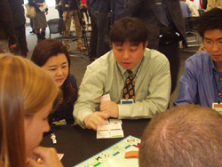 | 世界選手権2004日本大会報告 〜第9回:歯がゆい展開 岡田選手の1回戦。〜 こんにちは。 予選ラウンドの第1ウェーブで、 植田選手がいきなり破産するという、 日本にとって「まさかの」波瀾スタートとなっています。 一方、岡田選手のテーブルでは、 ゲーム残り時間がもうほとんどないというのに、 自力のダークパープル以外なにも色が揃っていない状況。 これでは誰もあまり得ではありません。 いったい何があったのでしょうか。 このテーブルのメンバーは、 チャンピオン(日本の岡田選手)、 アメリカ、ウクライナ、スイス、トルコ。 5人ゲームでした。 序盤に権利書が順調に購入できたのは 岡田選手とアメリカのマット選手。 この2人が展開の鍵を握ります。 特にマット選手はダークパープルを「自力」で揃えて ホテルを2軒建てており、有利な形です。 ここでマット選手は、 「時間切れになってもいいから確実に1位をとる」 ことを考えていたようです。 前回の世界選手権でもやはりアメリカ代表の選手が 「みんな家を建てずに、ぐるぐる回ろう」と呼びかけ、 似たような戦法をとったのですが、 前回のように「総資産評価制度」ならまだしも、 今回は「生き残り人数に応じたポイント制度」(注)です。 ゲームを決着させることを狙わずに 決勝進出、世界チャンピオンへの道は開けません。 (注)「生き残り人数に応じたポイント制度」: 前回までの世界選手権で採用されていたのは 「総資産評価制度」で、 ゲームごとの順位に関わらず、 予選全ての資産の合計で、決勝進出を決める仕組み。 この場合、たとえゲームでの順位が悪くても、 (破産した者は後に破産した者ほど順位が上で、 また破産しなかった者は資産の多い者ほど 順位が上となる) 全員が多額の資産をもつ状況になれば、 そのゲームの参加者全員にとって それほど悪いことではありません。 一方、今回採用された新制度だと、 資産ではなく順位で ポイントを競うようになったことに加えて、 破産者のポイントが 上位にボーナスポイントが与えられます。 そのボーナスポイントがかなり大きく、 例えば誰も破産させずに3連勝した場合より、 1回破産したとしても、残り2ゲームを モノポリー勝ち (自分以外の他のプレーヤー全員を破産させること) した方が、上位になります。 したがって、有利になったプレーヤーは 積極的にボーナスポイントを狙って、 カラーグループをそろえて家やホテルを建てて、 破産者を一人でも増やす戦略が基本的にベターとなります。 岡田選手はもちろんそのことを承知していたために、 積極的に交渉を仕掛けます。 具体的には、アメリカとトルコで レッド・イエローの「ツーペー」にさせ、 自分とウクライナで オレンジ・ダークブルーのツーペーにする、 という内容の交渉です。 4人が一斉にカラーグループを揃えあう形になり、 そのグループの特性からいっても、 ゲームは一気に「短期決戦」となる可能性が高い、 そういう提案です。 ![]() (硬直した局面打開のため交渉に熱が入る 岡田選手<中央>。 左は通訳の大橋さん。 モノポリーを事前に練習されたうえ、 交渉能力が非常に高く、頼もしかったです。) しかしマット選手はYesと言いません。それどころか、 「せっかくだから 世界チャンピオンの話術をもっとたくさん聞きたい。 だから簡単に成立させるのはもったいない」 と流されてしまう始末。 本人はウィットに富んだ 断り文句のつもりだったかもしれませんが、 このままでは共倒れになります。 「あそこは、大会のポイントシステムを説明するところまで 踏み込んだ会話をするべきだった」 後日この局面を振り返って岡田選手は、 このようにコメントしていました。 日本ではいちいち細かく説明しなくても、 動くべきときには動いてくれる、 そういう「聞き分けのよい」プレーヤーが多くなっており、 このような根本的な世話をする「訓練」が 最近は足りていなかったのかもしれません。 結局、このゲームでは、誰一人破産することなく、 というより、誰一人本格的に勝負に出ることなく、 タイムアウトになってしまいます。 居並ぶカメラ群は、 期待していた派手な家やホテルの乱立も、 高額紙幣のやりとりも、 一切キャプチャーすることができず、 ちょっとがっかりしたかもしれませんね。 予選の第1ウェーブが終了しました。 各テーブルの状況はどうでしょうか。 カナダが先頭をきって最初のモノポリー勝利。 続いてスペインもモノポリー勝ちします。 モノポリー勝利した場合のポイントは28点と大きいため、 この2国は決勝へ向けて 幸先のいいスタートといえるでしょう。 逆に、アメリカのように、 全員が生き残っているゲームでは、 たとえ手堅く1位となっても、 ポイントは16点しかもらえません。 予選通過のボーダーラインは 50点前後ではないかといわれている中で これでは残り2ゲームも 「連勝」しなければいけないという「立場」は 負けた場合となんら変わらず、 ノルマ