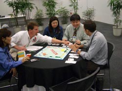 | 世界選手権2004日本大会報告 〜第13回:岡田選手の3回戦。 華麗に舞い、サクラチル〜 こんにちは。 予選のゲームも残るはあと1ゲームのみ。 「世界チャンピオン・岡田豊」の最後のゲームが はじまろうとしています。 お伝えしているように既に連覇の夢は絶たれていますが、 涙を拭いて、最後のゲームの生き証人となりましょう。 メンバーは、日本・ギリシャ・ポルトガル・グァテマラ。 4人ゲームです。 会場内にあれだけいたメディア陣も ほとんどが引き上げており、閑散としています。 岡田選手は最後まで 楽しんでプレイしようというスタンスのようです。 そして当然、最初に動いたのも岡田選手。 まだ2週目でカラーグループも ほとんど売れ残っている段階で、 グァテマラにレッドを揃えさせます。 全力で5軒建つ条件。 先行して経営する条件としては非常に魅力的であり、 もちろん成立。 グァテマラがレッドの経営を開始し、 岡田選手は鉄道3枚となります。 この早いタイミングでの交渉成立には、 他の選手たちも驚いているようです。 この先手先手を打つ動き方は、 普段の岡田選手を知っている人にはお馴染みなのですが、 外国人には驚愕でしょう。 遅まきながらこの雰囲気はトロント大会を思い出させます。 さてレッドは順調に成長して9軒になりますが、 そのころには残り3選手で ライトブルー・オレンジ・鉄道を揃えあうことができる 「3人3色」(注)の体制となりました。 この盤面で交渉を成立させないでいると グァテマラ以外の全員が不利でしたが、 なぜかギリシャの女性はかたくなに動くことを拒否。 ぐるぐる回っているうちに グァテマラがどんどん独走状態になります。 そしてギリシャは真っ先に苦しくなりした。 「これはギリシャが苦しくなってからが 本番だと思っていた」 岡田選手にとって、局面打開の大きなのチャンス! この結果、ようやく岡田選手が 鉄道4枚とオレンジを揃える体制となります。 (注)「3人3色」: モノポリーではどこかのグループを経営して、 自身の資産の収益性を高めていく必要があります。 したがって、グループ経営のための交渉には 多くの代償が必要になりがちです。 しかし、3人のプレーヤーが3つのグループを それぞれバラバラにもっている場合、 交渉を進めれば全員が何かのグループを経営できるため、 交渉がスムーズに進みます。 前述の「ツーペー」と同じ状況ですね。 さあ反撃開始と行きたいところですが、 どうも一周するたびにレッドに止まってしまい、 建築資金が思うようにたまりません。 やはり追撃の交渉をまとめるのに手間取ったことが 大きく響いているようです。 最後のチャンスとして、 鉄道を全部抵当に入れればオレンジに ぎりぎり7軒くらい建てられそうなタイミングも ありましたが、 さすがにワンチャンスに賭けるにしては条件が厳しすぎ、 しかもグァテマラは1回くらいオレンジ3軒に止まっても 痛くもかゆくもないくらいに潤沢に現金を持っています。 これは思い切ることもできず、 結局反撃らしい反撃もできずに討ち取られていきます。 ゲームが終了しました。 岡田選手は破産。 このゲームは 結局グァテマラがそのまま逃げ切って勝利です。 ![]() 予選最終ゲーム敗退後に 満足げにゲームを振りかえる岡田選手 この最後のゲームだけを見ても、 岡田選手らしく「暴れて」、 世界選手権らしく交渉で「苦しめられて」、 最後はダイス運つたなく「沈められた」といった、 ところでしょうか。 なんだかこう書くといいところなかったかのようですが、 始終ゲームを主体的に動かしていたのはやはり岡田選手。 勝っても負けても存在感だけは 誰にも負けないといったところはさすがだと思いました。 予選の全てのゲームが終了。 日本のお二人の最終成績はどうだったのでしょうか。 岡田選手がトータル4ポイントで、39人中38位。 植田選手はそのひとつ上の37位という成績でした。 数字の上では残念ながら惨敗です。 これがモノポリーです。 実力だけで順当に勝つことはありえないのです。 逆に言えば、誰にでも勝つチャンスがあるゲーム。 これこそがモノポリーの魅力なのですけれどもね。 決勝戦へ進んだ4人はどの選手だったのでしょうか。 続きは次回、いよいよ決勝戦。 |