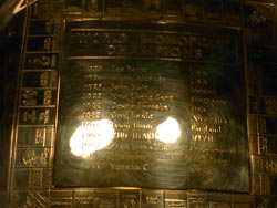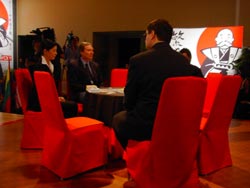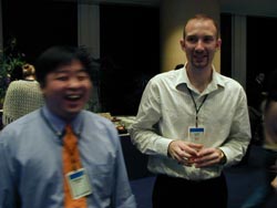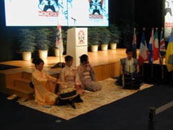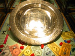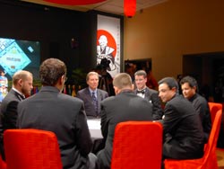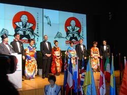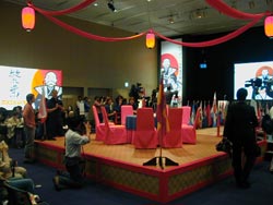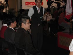 | 世界選手権2004日本大会報告 〜第15回:華やかな決勝の舞台〜 連載上は2004年10月9日の午後。 いよいよ決勝戦が行われます。 季節外れの猛烈な台風が東京を直撃する中、 六本木ヒルズ森タワーの49階に特設された会場は、 決勝を今や遅しと待っております。 決勝卓は日本の能舞台をイメージした レイアウトになっており、 全体的に赤と黒の2色で塗り分けられるデザイン。 そしてその舞台の周りには 世界各国の取材陣がぐるりと取り囲んで カメラを向けているのです。 ![]() 決勝卓は能舞台の上で 雅楽の演奏者もおり、欧米の選手たちにとっては、 エキゾチックな雰囲気に酔いしれることができそうです。 ![]() 決勝を盛り上げる和風の演出 ![]() 選手の入場を待つバンカー<左端>、 ジャッジ<左から二人目>、通訳<右2名>。 バンカーの方は「本物のバンカー」、 スタンダードチャータード銀行の洲崎さん。 非常にモノポリーに理解のある方で、 協会も大変お世話になりました。 この場を借りて御礼もうしあげます。 また会場の一角では軽食と飲み物が用意され、 またサイン交換用のモノポリーボードが サインペンとともに選手それぞれに用意されており、 参加者が親睦を深めることができるようになっています。 このあたりの主催者の気配りは モノポリーの世界選手権ならでは。 ![]() 軽食でも和風の演出、おしゃれ! 単に世界一を決めるだけの大会にとどまらず、 同じモノポリーを趣味にもつ者同士、 そんなに言葉は要りません。 お互いの健闘をたたえ、 貴重な時間を共有できたことに感謝します。 これこそ、モノポリーをやっていてよかったと思える 瞬間かもしれませんね。 ![]() 1988年世界チャンピオン百田さんも、 当時も今回も大会審判長を務められたOrbanes氏と 旧交を深めていらっしゃいました。 ![]() 米国代表と懇談する岡田「現」世界チャンピオン。 「あとちょっとの時間だけの世界チャンピオン」と からかわれ、思わず爆笑! やがて、和服の女性たちに先導されて、 4人の選手が入場してきました。 選手たちの服装は、 事前の計画では袴というのも案にあったそうですが 今までと同じくタキシードでした。 ゲーム盤の上にはカメラが設置され、 会場のメインスクリーンにその様子が映し出されます。 実際にテーブルの周りには取材陣が群がっており、 ほとんど客席からは 満足に見ることができなかった状態でした。 なので、ゲームの展開内容は このスクリーンにお世話になることになります。 ![]() 壇上の決勝進出者とミスターモノポリー。 背景にゲーム中継用のスクリーンがみえる。 お忙しい中駆けつけてくださった 糸井重里日本モノポリー協会会長をはじめ、 先日まで選手だった岡田さん、植田さんたち、 主だった日本のメンバーが観客席にて、 この観戦を楽しもうと集まっています。 ![]() 糸井会長もご臨席。 ところで、この決勝戦の模様を 全国の皆さんへお伝えしようと、 協会ではちょっとした「実況中継」を行っていました。 インターネット配信による、 十秒程度で切り替わる静止画像が2カメラ分と、 チャットスタイルでの「実況」という、 ささやかなものですが、 ボードゲームの特性上、 このほうが内容がわかりやすいというメリットもあります。 現在も当日のゲームのログが一部保存されていますので、 興味がある方はご覧になってみてはどうでしょうか。 当時の雰囲気をほんの一端だけでも 感じてもらえれば幸いです。 http://monopoly.amista.co.jp/wc04/wc04final.html なお、このスタイルでの実況は 今後の各種大会・イベントでも 不定期に行う予定があります。 都合が悪くて実際に参加できないという方も、 このことを覚えていただければ、 当日、協会のページをのぞいてみるようにすると いいかもしれません。 運がよければ中継だけでも 見ることができるかもしれませんよ。 次回はいよいよ決勝戦に突入! 会場の一角には 優勝者の名前を刻んだ金製のモノポリープレートが 厳かに飾られています。 次に名前を刻んでもらえるのは誰でしょうか? ![]() これが金製のモノポリープレート。 すごく厳かな雰囲気が漂う! ![]() 歴代優勝者の名前には1988年優勝の百田さんや 2000年優勝の岡田さんの名前も。 ![]() 決勝開始前の独特の緊迫感があふれてます。 |