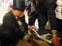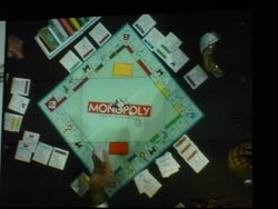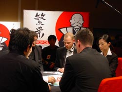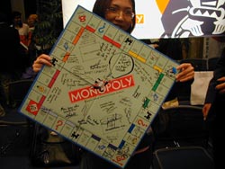 | 世界選手権2004日本大会報告 〜第16回:決勝戦前編、場内震撼の展開に〜 さて、決勝戦が始まりました。 まず注目すべきは、開始30分経過したところで スペインがオレンジの権利書3枚を自力したという点です。 この時点でスペインのアントニオ選手は、勝負をかけます。 手元に残った権利書のうち2枚を抵当に入れて現金を作り、 オレンジに家を7軒建築します。 表で残っているのは公共会社の電力水道のみです。 この電力水道までをも裏にすれば、 更に1軒は確実に建てることができますが、 そこまではしないようです。 ![]() 大事な決勝で、 最強のカラーグループと呼ばれるオレンジに 早くもかなりの家がたつ展開となり、 場内は騒然! ![]() 緊迫した展開に、 選手の眼光にも緊張感がみなぎる。 ![]() 有利な展開のスペイン、何を思う? スペインの建築を見届けるように、 ポーランドとノルウェーが交渉を始めます。 さすがにこの交渉は迅速にまとまった模様です。 ほどなくポーランドが裸でイエローを揃えました。 イエローにはまず家が5軒建ちます。 手元にはもう1軒分くらいの現金が 残っているようですので、 これは有望な追撃態勢といえます。 ノルウェーは鉄道3枚を持ちます。 アイルランドは まだこれといった収入源になるような形にはなっておらず、 グリーンやライトパープルなどの まだ権利書全てが売り切れていない カラーグループの権利書ばかり。 すぐに家がたつ展開ではなく、これからに期待ですね。 予選1回戦でお見事な先行逃げ切り、 「ヨセ」の技術を披露したアイルランドですが、 この「追撃」の立場に回っての手腕は いかがなものでしょうか、拝見したいところです。 このあと、ノルウェーがぞろ目でオレンジ、イエローに 連続して着地します。 どちらも家が2軒建っている土地でしたので、 スペインに200ドル、 ポーランドに330ドルの支払いをします。 これでカラーグループはどちらも育ちやすい形となり、 このままいくと スペインとポーランドの一騎打ちとなりそうです。 特にアイルランドは何か動かないといけません。 ノルウェーは次の番で、チャンスカードをめくります。 めくったカードは「修理費」。 家を建てていないノルウェーが 修理費を引いてしまいました。 そしてその直後には、 スペインがチャンスのマスに止まったのです。 もしスペインが先にこの「修理費」を引いていれば、 オレンジの増築に待ったがかかっていたはずでしたが、 この頃から追い風はスペインに吹いていたようです。 さてその頃決勝の舞台裏では、 参加者どうしのサインが大流行。 ちなみに一番人気はミスターモノポリー! さすがですね。 ![]() 選手は互いにサイン交換 ![]() サインに大忙しのミスターモノポリー ![]() ボード一杯に広がるサインの数々 続きは、次回。 |