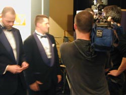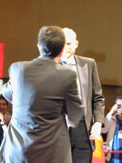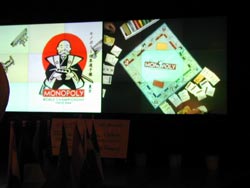 | 世界選手権2004日本大会報告 〜第17回:決勝戦後編、新チャンピオン誕生〜 こんにちは。 世界チャンピオンが決まる決勝もいよいよ佳境です。 決勝卓を取り囲む国際色豊なメディア陣も ヒートアップしています。 ![]() 決勝卓のまわりはカメラの放列 決勝戦でスペインがオレンジを自力、 対抗してポーランドがイエローを経営開始、 といった局面のその後です。 アイルランドとノルウェーはようやく交渉をまとめ、 アイルランドがライトパープル、 ノルウェーが鉄道4枚を揃えました。 ちょっと遅かった気もします。 特に鉄道は早めに4枚にしておかないと、 オレンジやイエローへのけん制効果になりません(注)。 事実、この後のオレンジは余裕で増築して 4軒ずつに増やしています。 (注)鉄道の効果: オレンジやレッドといったカラーグループは 権利書をそろえ、建設料を払って家やホテルをたてて、 その土地に泊まったプレーヤーからいただく レンタル料を高くします。 一方、鉄道や電気・水道は家やホテルを 建てることができません。 しかし、鉄道は2枚になれば1枚の時の倍に、 3枚なら1枚の時の4倍に、 4枚なら1枚の時の8倍に、 それぞれレンタル料が大幅に増額されるので、 家やホテルを立てて手持ち現金が少なくなりがちな カラーグループ経営者にとって、 なかなかの脅威になります。 そしてそのオレンジに、ポーランドが止まってしまいます。 イエローは崩壊。 この瞬間にゲームはかなり傾いてきました。 アイルランドには家が1軒ずつしか建っておらず、 対抗勢力たりえません。 このままではスペインの勝利は誰に目にも明らかです。 唯一お金を持っていたと思われるのはノルウェーですが、 鉄道とイエローを交換する交渉は 提示しているのかいないのか、 何度か話はしていたようですが、 権利書が動く気配はなく、 そのままゲームが進みます。 そうこうしているうちに、 アイルランドのアンソニー選手が ニューヨークのホテルに着地。 これは救済されず、破産となります。 アンソニー選手は、 予選では上手な先行逃げ切りを披露していましたが、 追いかける側の立場となった決勝戦では、 これといった見せ場もなく消えていきました。 またの活躍を期待したいところです。 選手は残り3名となりました。 圧倒的に有利なのはスペイン。 残り2国、ポーランドとノルウェーは 協力して立ち向かわなければならない場面です。 ポーランドはイエローに家が2軒ほど残っていますが、 もちろんこんな勢力で オレンジホテルにかなうとは考えられません。 一方のノルウェーは、 一回オレンジホテルに突っ込んでおり、 苦しいことは苦しいのですが、 それでもなんとかできそうな場面。 私見ですが、ここはポーランドも奮発して ノルウェーを大応援しなければいけないところだと 思います。 イエローを中途半端な条件で経営スタートしてもらっても、 スペインにとっては脅威となりません。 圧倒的に有利なスペインを引きずり下ろすためには、 イエローの土地のどこかに3軒目を建ててもらい(注)、 そこにスペインが着地して 800ドル(または850ドル)の大打撃を与える。 そうしてオレンジとイエローが 「殴りあう」展開にしてもらうしかないのです。 (注)家3軒目の建設: カラーグループの経営において、 家を2軒でとどめる場合と3軒目を建てる場合とでは、 その土地にとまった際に支払うレンタル料に 非常に大きな差が生じます。 例えばイエローの2軒のレンタル用は330ドルか360ドル、 一方3軒では800ドルか850ドルとなり、 レンタル料になり、 2軒の際の2倍以上にふくれあがります。 したがって、相手に大きなダメージを与えるためには 何とか3軒目を建てたいところです。 そういう展開になってはじめて、 ポーランドにも安くカラーグループを入手し 経営開始するチャンスが巡ってくるのです。 とにかくまずはスペインの「独走状態」を止めないことには 道は開かれません。 もちろん、その間、自分は両方の土地を 完全に回避し続ける必要があるので、 条件は非常に厳しいのですが、 何もしないで回っていて100%確実に負けるよりかは、 天文学的な数字に賭けてでも 「やるだけやってみる」ことが大切な気がします。 ギャラリー席に陣取っている地元日本人の観客たちも そのことは重々承知しており、 「今しかない」とささやきあっています。 しかし交渉はおきず、 スペインのアントニオ選手はダイスを振り マービンガーデンへ着地。 大きなため息が発生したのは、 糸井会長が陣取る日本人のいる一角だけでした。 「なぜやらなかったんだ? 世界一を決めるゲームらしく、勝負して欲しかった」 苦笑しながらもそうコメントする、 「あと数分の世界チャンピオン」 岡田さんのコメントが印象的でした。 ![]() 糸井会長と岡田さんが並んで観戦、 問題の場面では互いに大きなため息。 アントニオ選手は自分の身に降りかかりそうだった危機を 無事に回避したことがわかっていたのでしょう。 こ