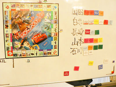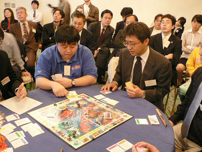 | 2007年度モノポリー日本選手権 全国大会結果報告(その15) こんにちは。 今回は、今年の日本チャンピオンを決定する 大一番の決勝戦がいよいよ開始されるところからです。 13時59分、決勝戦が厳かに開始されました。 最初の交渉は、岡田さんと白井さん。 パワー(電力水道)を揃えあう交渉です。 パワー(電力水道) ピクサー版モノポリーでは、 「スクリームパワー」 (叫び声を電力に変えるということ)と 「ラフパワー」(笑い声を電力に変えるということ)が あります。 ディズニーアニメ「モンスターズインク」にちなんだ マスですね。 これはスタンダード版モノポリーの 電力水道にあたります。 レンタル料は安く、勝負の行方を左右することは ほとんどありません。 そのため、電力水道だけの交渉はそれなりに 気軽にできます。 もちろん、今回のようにカラーグループの権利書も からめた交渉に発展すれば 勝負に直結する可能性があります。 ![]() ▲交渉する岡田さん<左>と白井さん<右>。 なおプレーヤーを囲むようにギャラリーが見学してますが、 視線が遠くにある方が少なくないのは、 決勝の様子を再現している大盤に見入っているためです 白井さんは初手で「全員に50ドル払う」のカードを 引いてしまっていることもあり、 お金は出したくないと主張します。 これを受けて岡田さんは、 レッドとダークブルーをもらうかわりに パワーとヘリコプター(鉄道)に お金を300ドルつけると提示します。 白井さんは400ドルを要求し、これは成立。 序盤から大きな金額が動きました。 白井さんは資産の少ない序盤のビハインドを補うために 現金を補填する内容で、 一方の岡田さんは現金を失ってでも 有力カラーを手にする内容で、 それぞれの思惑が一致したようです。 ヘリコプター(鉄道) ピクサー版モノポリーでは、 スタンダード版の鉄道の代わりに 「ヘリコプター」や「カーズ」など、 ディズニーアニメにちなんだマスが登場します。 スタンダード版モノポリーの鉄道は、 投資効率の良い物件でして 手持ち現金が不足気味のプレーヤーにはねらい目です。 しかし、これだけで勝利できるわけではありません。 鉄道で稼いだ上で、勝負に直結するカラーグループを 経営していく必要があります。 続いて山本さんから石川さんへの交渉です。 ここでの焦点は既に3枚売れ切れているグリーン。 山本さんと石川さん、そして長崎さんが 1枚ずつを持っています。 特に権利書があまり買えていない山本さんとしては、 価値が高いうちにこのグリーンを 有効活用したいところでしょう。 山本さんは、 「これがあれば石川さんが主導権を握る形ですから」 とのセールストークで、 グリーンの権利書1枚に現金を100ドルつけ、 代わりに石川さんからはイエローとライトパープルを 出してほしい、との内容を提示。 この交渉は成立します。 グリーン グリーンは手持ち資金豊富な「お金もち」が経営する 「高級住宅街」。 外国のプレーヤーは大好きです。 そしてもうひとつの特徴は、投資効率の悪さ。 それゆえに、日本では不人気です。 でも他のカラーグループが売り切れる前に、 先行して経営して攻撃する「速攻」に適した カラーグループともいえます。 あまり毛嫌いせず、グリーンでいろいろ 試してみることをお勧めします。 続けて石川さんが長崎さんへ交渉を申し込みます。 石川さんは自分が経営したい様子でしたが、 ここは長崎さんも様子を見ます。 4軒スタートできる現金残しの条件まで出ましたが、 いったん決裂します。 ![]() ▲序盤の各プレーヤーがもつ権利書とコマ位置が一目でわかる大盤。 今回の決勝は珍しく、全員はそこそこ買えた展開でした さて、石川さんと長崎さん。 どちらがグリーンを経営することになるのでしょうか。 また一方では、岡田さんから白井さんへ、 レッドを揃える交渉もはじまりました。 こちらは成立するのでしょうか。 次第に、決勝テーブルは、 周囲の観客も含めてボルテージが上がってまいりました。 どうやらゲーム前半の山場を迎えてきたようです。 (原文:1999年モノポリー日本チャンピオン 宮野徹 監修:日本モノポリー協会専務理事・ 2000年モノポリー世界チャンピオン 岡田豊) |