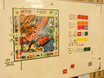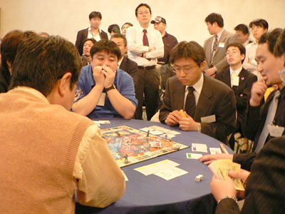 | 2007年度モノポリー日本選手権 全国大会結果報告(その17) こんにちは。 モノポリー日本選手権の 決勝卓の様子をお送りしています。 局面はまさに山場を迎えつつあります。 「カラーグループを揃える」 という最も基本的かつ重要なテクニックにおいて 日本一を争う場面では どのように交渉を進めているのでしょうか? 読者の皆様にはぜひ 交渉のタイミング、権利書を含めた大胆な交渉手法などを、 少しでも感じ取っていただければ幸いです。 さて、石川さんがダイスを振って 「DINOCO HELICOPTER」(ペンシルバニア鉄道に相当)まで 進みます。 本当はもう少し進みたかったかもしれません (次に4以下を振るとまだオレンジに 止まる可能性がある)が、もう待ったなしです。 石川さんと白井さんとの間で、 白井さんがオレンジをそろえる交渉開始です。 白井さんは権利書2枚を放出してオレンジを揃えます。 まだ手元には他にも権利書が3枚残っており、 楽々9軒スタートできる条件。 これはちょっと安かったかもしれません。 いずれにしても、 レッド経営者の岡田さんを 直接狙い撃ちできるオレンジ経営により、 俄然有利な位置に浮上しました。 9軒 モノポリーの家の建て方では、 各土地に3軒目を建てるのが 最も経営効率が良いとされます。 レンタル料が2軒の際と3軒の際では かなり違うからです。 9軒を建てるということは、 3箇所の土地がセットのカラーグループで、 (3軒、3軒、3軒)というふうに、 どこか一つが3軒目になっている状態を指します。 勝負できる状況だといえましょう。 オレンジ カラーグループの中で止まる確率が高いだけでなく、 コーン(家)の建設費も割安で、 すぐに増設ができるため、 最も勝利に近いとされるカラーグループの一つです。 日本人の中では最も人気があります。 オレンジの9軒を見て 山本さんもイエローを5軒に増築。 山本さんとしては このあと自分の行き先である グリーンが揃うことを見越して、 多少の「守備力」も残しておきたかったのでしょう。 しかしこの展開では様子見をしている時間はない、 と判断したのだと思います。 ![]() ▲オレンジが揃った直後の盤面の様子。 数字が書いてあるのが、コーン(家)の数です。 ギャラリーにはなかなかわかりやすいので好評です さてオレンジに狙われているのは、 刑務所見学にいる岡田さんです。 その岡田さんが振った目は、2ゾロ。 続けて7を振って無事にオレンジを抜け、 無事に自宅のレッドである 「SULLEY & MIKE'S APARTMENT」 (ケンタッキー通りに相当)に着地します。 思わず会場からも「今日は大丈夫でしたね」との台詞が こぼれ、場内は緊張の糸が切れて爆笑。 ひょっとすると、ここで一瞬 油断してしまったのかもしれませんね。 「今日は大丈夫でしたね」 岡田さんは2002年の決勝、優勢ながらも 同じような局面でオレンジに止まり、 優勝できませんでした。 その印象的な局面とかぶらせて、 この決勝を見ていた方が少なくなかったのでしょう。 岡田さんはレッドを6軒まで増築して、 今度はオレンジ経営者の白井さんに カウンターを仕掛けます。 このように一瞬で攻守が入れ替わるのも モノポリー中盤以降の醍醐味のひとつでしょう。 ところがここで、長崎さんが先に オレンジに突っ込んでしまいました。 550ドルの支払い。 もちろんまだ払えますが、 これで白井さんのオレンジは ますますの脅威となったでしょう。 一同の警戒心は盤上のオレンジにぐっと移ってきました。 ![]() ▲長崎さん(右端)がオレンジに止まった場面。 さすがに長崎さんも苦しそうです 白井さんのオレンジがまず、火を噴きました。 岡田さんのレッド、山本さんのイエローも、 この後爆発する隙をうかがっています。 このまま3人の殴り合いになるのでしょうか。 一見、取り残される形になりかけているのが石川さんです。 しかしまだ、石川さんには長崎さんからグリーンを揃える、 という道が残されています。 今度こそ不退転の決意をもって、石川さんは交渉を申し込みます。 流れはどう変わるのか。 続きをお楽しみに。 (原文:1999年モノポリー日本チャンピオン 宮野徹 監修:日本モノポリー協会専務理事・ 2000年モノポリー世界チャンピオン 岡田豊) |