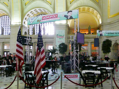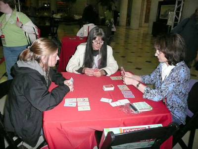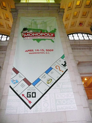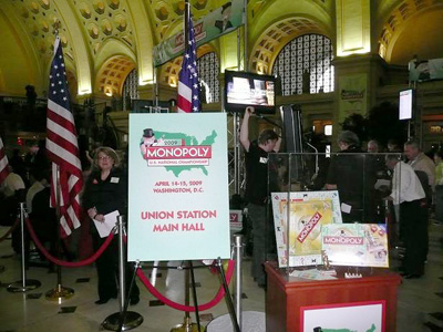 | モノポリー米国チャンピオン決定戦に 行ってきました(8) 「ユニオン駅編」 このたび、私こと 岡田豊@2000年モノポリー世界チャンピオンは、 モノポリー米国チャンピオン決定戦 「2009年モノポリー米国選手権」を見るため、 米国時間4月13〜16日、ワシントンDCにいってきました! 今回はその八回目の報告になります。 このコラムはモノポリー米国チャンピオン決定戦の ものですが、日本では モノポリー日本一決定戦「モノポリー日本選手権」が 終盤戦となっております。 6月7日に開催されました関東地区大会には、 ほぼ日読者の皆様にも多数参加いただき、 本当にありがとうございました。 新しい方が非常に目立った大会でして、 皆さん、それぞれに自分なりのテクニック、 楽しみ方をお持ちでした。 私の経験上、そういう方はこれから急激に上達されます! 今後の活躍が楽しみな方ぞろいの大会でして、 スタッフであった私もぜひ対戦してみたいと思う方が 多かったですね。 6月14日(日)の 九州地区大会(福岡・キャナルシティ)にて、 地区大会は終了いたします。 九州地区大会は全国から参加可能なイベントですので、 多くの方が挑戦されるのを待っております。 詳細は大会申し込みサイトをご参照ください。 さて連載の続きです。 モノポリー米国チャンピオン決定戦は予選1回戦後に 過去のチャンピオンだけで行われた エキシビションが終わったところです。 この時点で時間は真夜中の1時。 参加者、見学者、メディア、ハズブロスタッフの皆様、 本当にお疲れ様でした。 翌日、いや正確には当日に、 予選2,3回戦と米国チャンピオンが決定する Finalが予定されています。 集合時間はなんと朝7時! それにも関わらず真夜中1時までモノポリーを楽しむとは、 モノポリー好きの方の行動は、各国共通ですね。 確かに、日本チャンピオン決定戦でも、 大会そのものとは別に、 真夜中までモノポリーを楽しんでおられる方が、 多数いらっしゃいますし。 残りのイベントはワシントンDCの公共交通の要所である ユニオン駅にて行われます。 米国は基本的に車社会でワシントンDCも 例外ではありませんが、 鉄道網はそれなりに充実しています。 ワシントンDC内移動には地下鉄が便利で、 ビジターには助かります。 そして都市間移動にはなんといっても列車です。 ユニオン駅はその都市間移動の要所なのです。 ![]() ▲大会会場のユニオン駅。全米でも1,2を争う 巨大なターミナル駅です。 日本でいえば、東京駅といったところでしょうか。 日本の駅に比べて、荘厳なイメージが印象的ですね。 モノポリーと鉄道は非常に相性がよく、 多くのバージョンで鉄道が登場します。 例えば最初に発売されたアトランティックシティ版 (米国や日本ではスタンダードとなっています) では4つの鉄道が登場します。 そういえば2003年に開催された、 前回の全米チャンピオン決定戦は 決勝の会場こそアトランティックシティのホテルでしたが、 予選の3試合は、なんと移動中の列車の中で 行ってしまいました。 今回は決勝まで、ユニオン駅のオープンスペースにて、 つまり一般観衆の目の前で開催されます。 ![]() ▲会場の様子。画像では暗そうですが、 実際はそれほど気になりません。 平日ですので、忙しそうに行きかうサラリーマンも 少なくなかったのですが、 「モノポリーの大会やってるの?」みたいな感じで、 足を止めてちょっと見ていく方が多かったですね。 もちろん、観光客はじっくり見学されていました。 ![]() ▲壁には巨大な垂れ幕も用意され、雰囲気を盛り上げています。 ![]() ▲床にもモノポリーの画像が貼ってありました。細かい芸ですね。 ![]() ▲入り口の様子。一応仕切りがありますが、 出入りは比較的自由でした。 ![]() ▲オープンスペースなので行きかう人々に向けて、 モノポリーをさらにアピールするチャンス。 一押しの最新バージョンを掲示して、注目を浴びておりました。 ![]() ▲見学者が実際にゲームできるよう、テーブルが用意されています。 さすがに時間の問題で1ゲームされる方は いらっしゃらないようでしたが、 人気は短時間で終わるモノポリーカードゲーム。 無料で配られていたこともあり、多くの方が遊んでいきました。 ![]() ▲見学者に無料のモノポリーカードゲームをプレゼントする ハズブロスタッフ<真ん中>。 本当に献身的に、見学者の相手をされてまして、 「どんなイベントを開催しているのですか」みたいな質問にも 丁寧に答えていました。 気のせいか、見学者の相手をするスタッフには 見映えのよさそうな方が多かったような。 会場の雰囲気はさすがにすばらしく、 米国チャンピオン決定戦らしい盛り上げぶりです。 そのため、予選のゲームの様子を紹介する紙幅が なくなってしまいました。 次回は予選の実際のゲームの様子を紹介いたします。 (文章:日本モノポリー協会専務理事・ 2000年モノポリー世界チャンピオン 岡田豊) |
