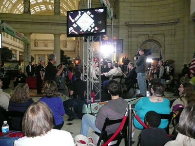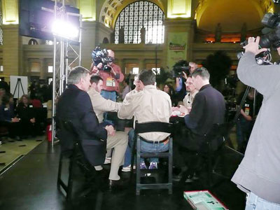 | モノポリー米国チャンピオン決定戦に 行ってきました(11) 「決勝編」 このたび、 私こと岡田豊@2000年モノポリー世界チャンピオンは、 モノポリー米国チャンピオン決定戦 「2009年モノポリー米国選手権」を見るため、 米国時間4月13〜16日、ワシントンDCにいってきました! 今回はその11回目の報告になります。 二日にわたって開催されました モノポリー米国チャンピオン決定戦、 ついに米国チャンピオンが決まる「決勝」の わずか1ゲームを残すのみとなりました。 決勝は会場真ん中に作られた特設ステージにて、 1ゲームのみ開催されます。 観客はもちろん、メディアにも囲まれた形で開催される、 非常に独特の雰囲気となります。 またこれまではゲームの終了時間が決まっていましたが、 この決勝はデスマッチ。 他のプレーヤー全員を破産させるモノポリー勝ちまで、 つまり米国チャンピオンに輝く最後の1人になるまで、 何時間でもゲームを続ける、過酷な仕組みです。 これまで以上の緊張感が会場には漂い、 観客も容易には声を出せない雰囲気になりました。 米国チャンピオン決定の瞬間をみようと、 駅構内の通行人の中には長時間立ち止まる方も ぽつぽつ出てきました。 ![]() ▲決勝進出者4名を発表するMr. Monopoly。 独特の口調で、次々と進出者を発表していきます。 また惜しくも決勝に進出できなかった他の選手からも、 大きな拍手が送られます。 ![]() ▲二日間、完全密着で映像を撮っていた 「モノポリードキュメンタリー」の面々。 非常に仕事熱心な方々で、私も取材を受けました。 彼らは米国選手権だけでなく、世界各国の国内選手権を記録にとどめ、 「モノポリードキュメンタリー」を作成しています。 ![]() ▲決勝の様子。 おそろいのブラウンのシャツを着ているのが4人の決勝進出者。 これまではタキシード着用だったので雰囲気は一変しました。 これまでは予選の次の日が決勝だったので、 タキシードを採寸して用意する余裕があったが、 今回は予選に引き続いてすぐに決勝なので無理だったのでしょう。 なお黒いシャツを着ているのが銀行係(右)と審判(左)。 ![]() ▲場内では決勝しか開催されていないので、 全員が取り囲んで注目しています。 何台ものビデオカメラによってメディアの注目も浴びます。 ![]() ▲1999米国チャンピオン(左から2人目)と、 2003米国チャンピン(右から2人目)が 並んで決勝を見学しています。 決勝進出者は全員男性。 米国選手権にこれまで何度か参加された方もいて、 いつもよりも豊富なモノポリー経験をもつ方が 多かったようです。 そのためか、決勝も落ち着いた雰囲気。 交渉がかなりきれいにまとまって、 全員がカラーグループを経営するという、 非常に理想的な展開に。 4人全員にチャンスがある展開ですが、 過去に決勝進出経験がある 4人の中では最も高齢の方が 複雑な交渉を主導的に取りまとめていたテクニックを 生かして、うまく局面をリードしているように見えました。 会場内のフリークの間でも優勝者を予想する会話が あちこちでありましたが、 一番人気はこのナイスミドルのプレーヤーでした。 私も質問を受けると、彼が有利だと答えていました。 ![]() ▲交渉が始まる前の盤面の様子。 順調に権利書が売り切れているものの、 全員に満遍なく散らばり、この後の交渉がわかりにくい。 なお、このように盤面の様子が手に取るようにわかるよう、 決勝の様子は場内の大型モニターで中継されている。 ![]() ▲何回かの交渉が終えた後の盤面の様子。 全員がカラーグループを経営しているのがわかります。 複雑な交渉をよくまとめたという感じで、 決勝進出者のレベルが総じて高かったからでしょう。 誰にもチャンピオンになるチャンスがくるという、 理想的な展開になりましたが、 オレンジ色を経営するプレーヤーが一番人気でした。 でも多くの方が何か大事なことを忘れています。 この決勝もあの「恐怖のスピードダイス」を 使用しています。 これまでの経験からの予想はまるで意味がないような。 次回はついにチャンピオン決定! 波乱に富んだfinalの終盤の様子を紹介いたします。 (文章:日本モノポリー協会専務理事・ 2000年モノポリー世界チャンピオン 岡田豊) |