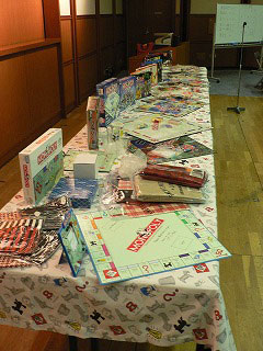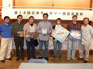 | 第14回 日本モノポリー協会会長杯モノポリー大会 結果報告 こんにちは. 今回は5月3日に東京で開催された、 「第14回日本モノポリー協会会長杯モノポリー大会」の 結果をご報告させていただきます. この会長杯モノポリー大会は、 日本モノポリー協会会長である糸井重里さんの モノポリー界でのこれまでの多大な功績を 記念する大会です。 優勝者にプレゼントされる 糸井会長のサイン入りモノポリーボードは 今年も参加者全員にとって垂涎の的でした。 また糸井会長よりプレゼントしてくださる 多くのほぼ日グッズも参加者にとっては 毎年、非常にうれしいものですね。 ![]() 糸井会長のサイン入りモノポリー ![]() ほぼ日グッズは会長杯恒例で大人気 また今年は例年以上に大量の輸入グッズが 賞品として参加者の皆様にプレゼントされました。 ひそかな人気をあつめたのは 「メガマック」のモノポリー版といいましょうか、 モノポリーのスタンダード版を2倍ほどにした 「メガモノポリー」でして、 昔からのユーザーほどほしがる方が多かったですね。 ![]() ずらりと並んだ輸入モノポリーボード ![]() ひそかに人気を集めた「メガモノポリー」<右> 今年はGWに首都圏で モノポリーイベントが目白押しでして、 その口火を切った会長杯は 約100名の参加で大盛況でした。 また5月5日子供の日に群馬にて開催されました島朗杯は、 過去最高の参加人数でした。 ともにほぼ日読者の皆様に本当に多くご参加いただき、 本当にありがとうございました。 ![]() 大勢の参加者でまさに「大入り」 さて会長杯の結果ですが、 2ゲームを終えて決勝テーブルに進出されたのは、 大湊亮さん(2006年会長杯チャンピオン)、 三村和成さん(モノポリーソフトでは不世出の名作として、 いまなお愛好者が絶えない 「SFCモノポリー2」のゲームプログラマー)、 今井清嗣さん(2006年度日本選手権ファイナリスト)、 辻本卓さん(2006年度日本選手権ファイナリスト)、 井上聖那さん(2004年会長杯チャンピオン、 当時は史上初の現役女子高生チャンピオンとして、 モノポリー界が震撼)、の5名でした。 会長杯といえば若い世代の台頭で有名でしたが、 今年はこれまでいろんな大会で 好成績をあげられてきた方々が 決勝卓にならびました。 決勝は当然、非常に熱い戦いとなり、 モノポリー決着はできませんでしたが、 僅差の資産差で優勝されたのは、 昨年会長杯チャンピオンの大湊さん。 本当におめでとうございました。 近年ではきわめてまれな同一大会連覇で、 今秋開催予定の日本選手権全国大会での活躍が 期待されます。 ![]() 左から岡田さん2000年世界チャンピオン、 今井さん、辻本さん、優勝者の大湊さん、 井上さん、三村さん、大木さん2006年日本チャンピオン 会長杯から始まったモノポリーシーズンは この秋開催予定の モノポリー日本一決定戦「日本選手権全国大会」まで 熱気を増していくばかりです。 7月も7月1日(日)九州杯(北九州)、 7月15日(日)名人戦(東京)の2大会が 予定されており、 9月からはモノポリー日本一決定戦「日本選手権」の 「地区大会」が全国各地で予定されております。 モノポリー大会で優勝され、 次の日本チャンピオン候補に名乗りをあげるのは 今この記事を読んでいるあなたかもしれませんよ。 ぜひお気軽に大会にご参加ください。 なお大会の全成績は 日本モノポリー協会主催モノポリー大会の公式成績を 掲示してくださっている 99年日本チャンピオン宮野さんの成績管理サイト (2007年会長杯の成績一覧はここ) |