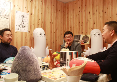 | 重松 | (ムーミンクッションを抱いて) ほら、俺たちは、3人とも、 ムーミンみたいな体形だから。 そんな3人が揃ったということで、 ムーミン体型座談会だね。 |