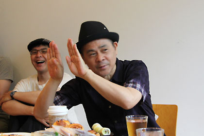 | ハマケン | いやいや、それはともかくですね、 たいへんな思いで 描かれたマンガっていうのはわかりますよ。 ──なんか、ぼく、人に言われたことあって。 「自分が望まれなくてもそこに行って、 ライブする力を身につけろよ」って。 |