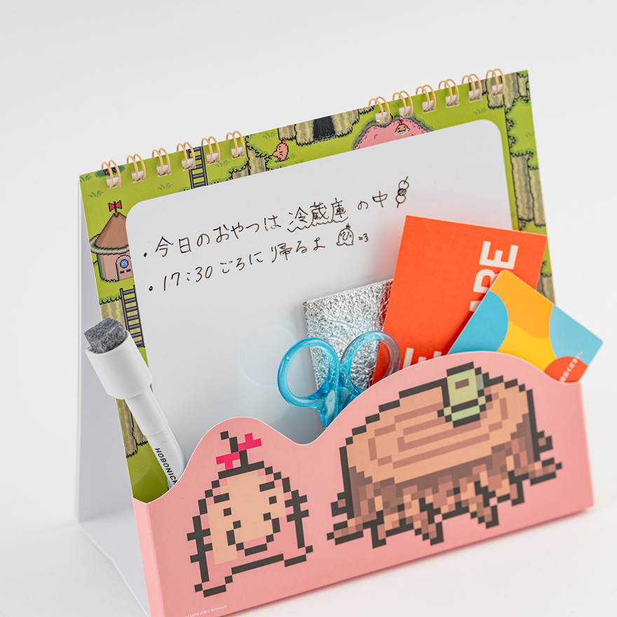 The Desktop Size with Pocket is a calendar that sits atop your desk and is nice and compact at 172 mm wide x 177 mm tall (6.8" x 7"). It contains an erasable message board and a storage pocket on the opposite side to store things like tickets, receipts, and other postcard-sized items so you can always remember exactly where you put them.