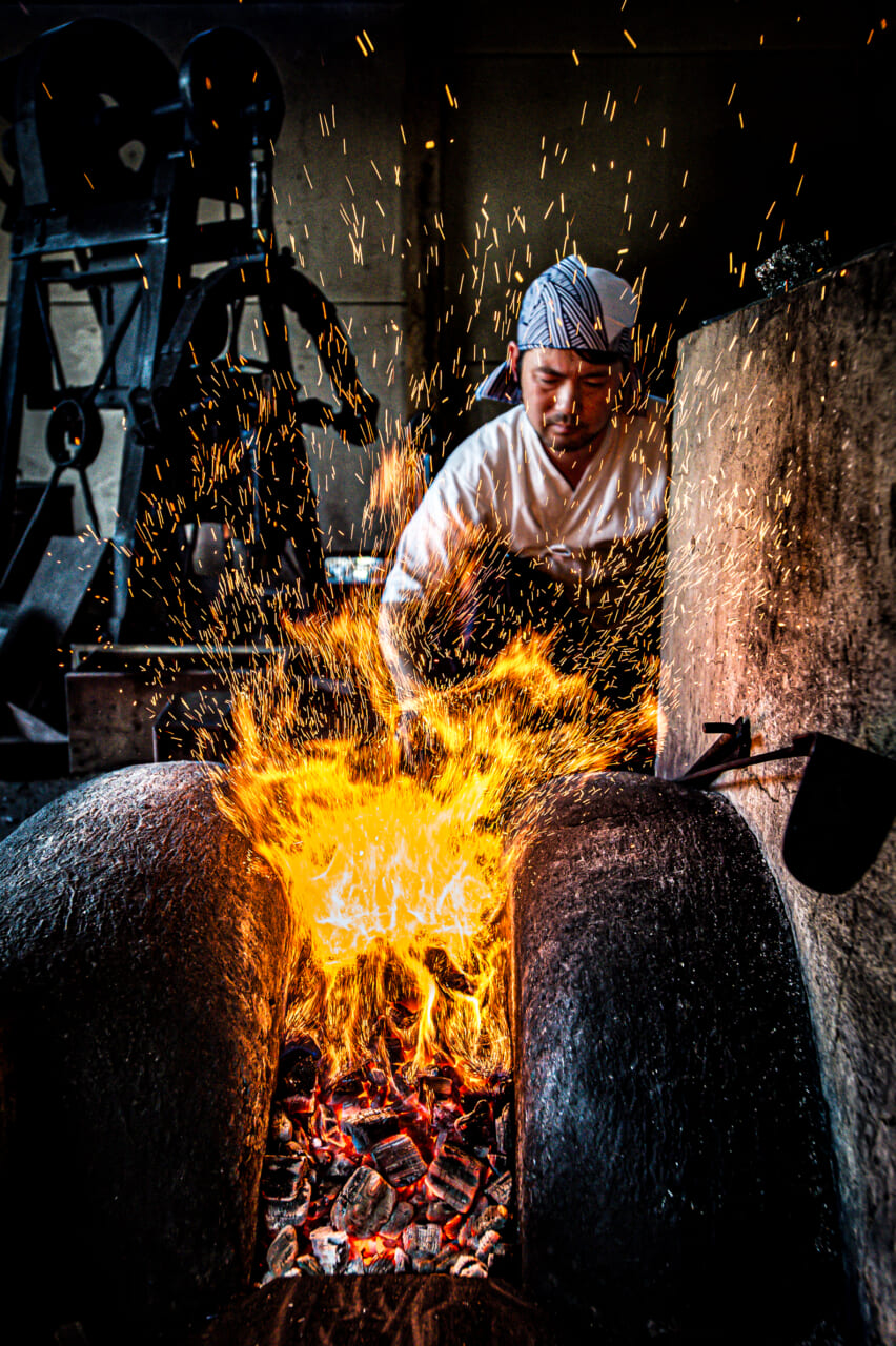 鞴(ふいご)で風を送っています。 - 火力を調節する道具ですね。