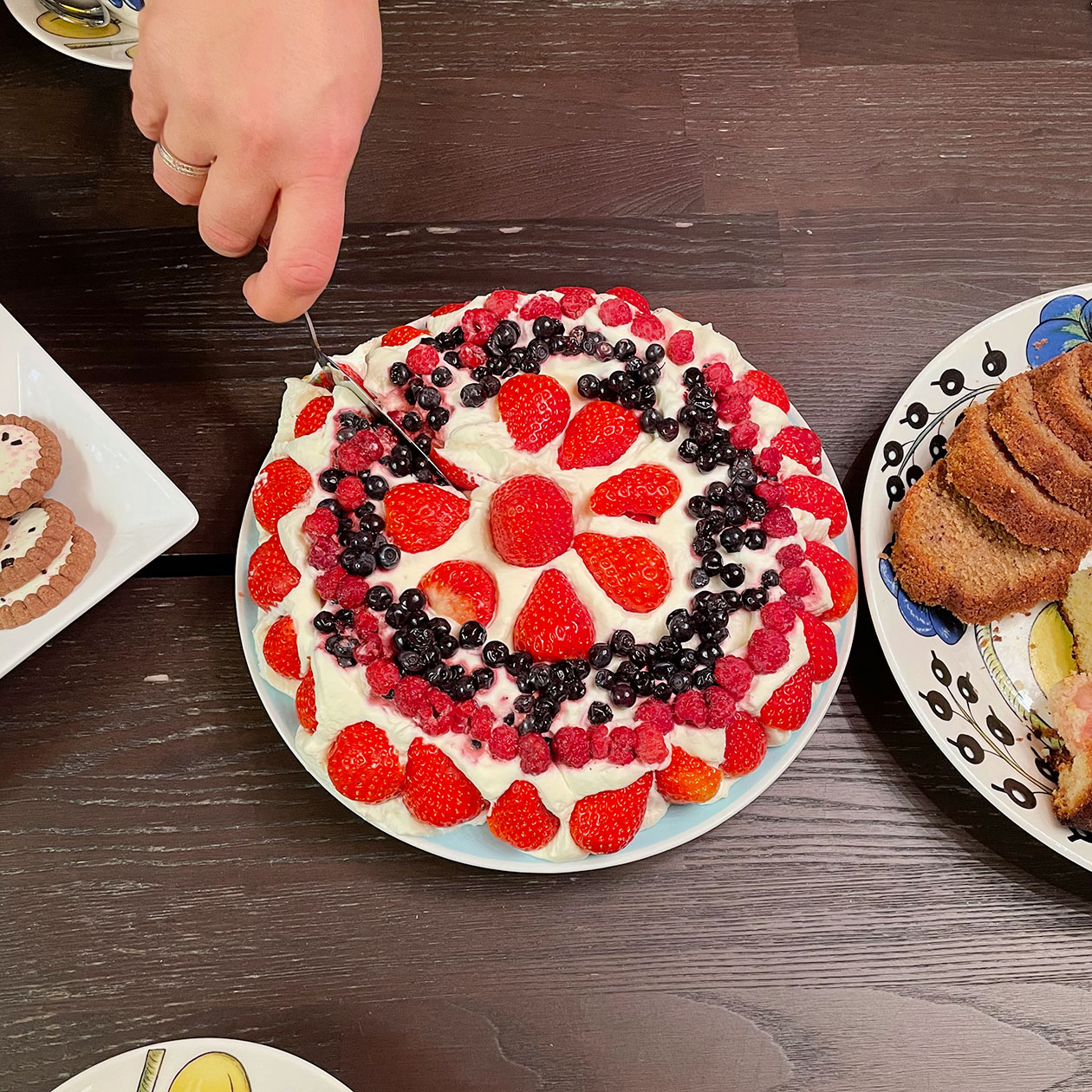 サーモンスープとホームメイドのケーキでもてなしていただく。