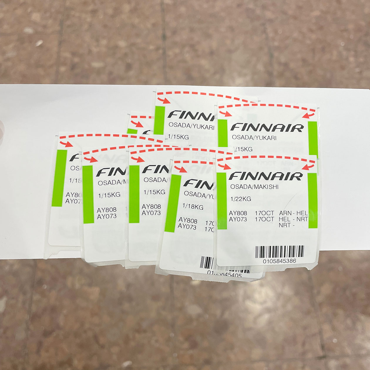 裏面はバゲージラベルで一杯の搭乗券を手に、