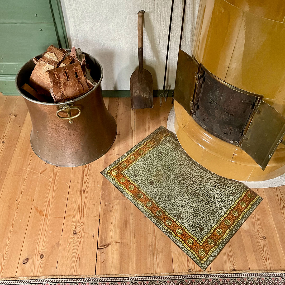薪入れにしている銅のバケツや木の持ち手のスコップは、