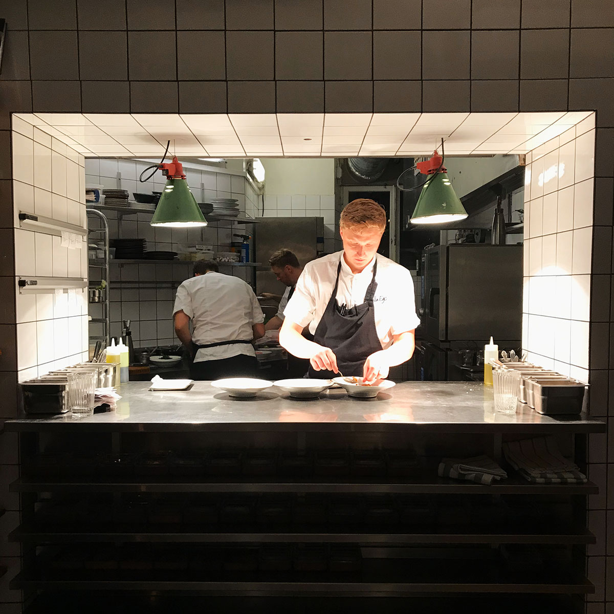 - 清潔なキッチンに、テキパキと働くシェフ。