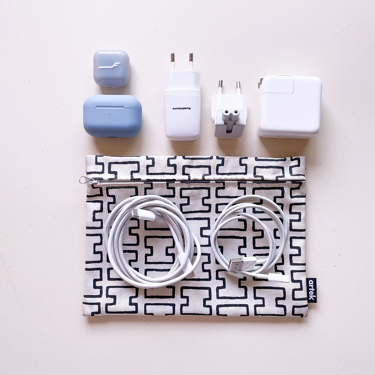 下はワイヤレスイヤホン、Macとi phone用のケーブル。